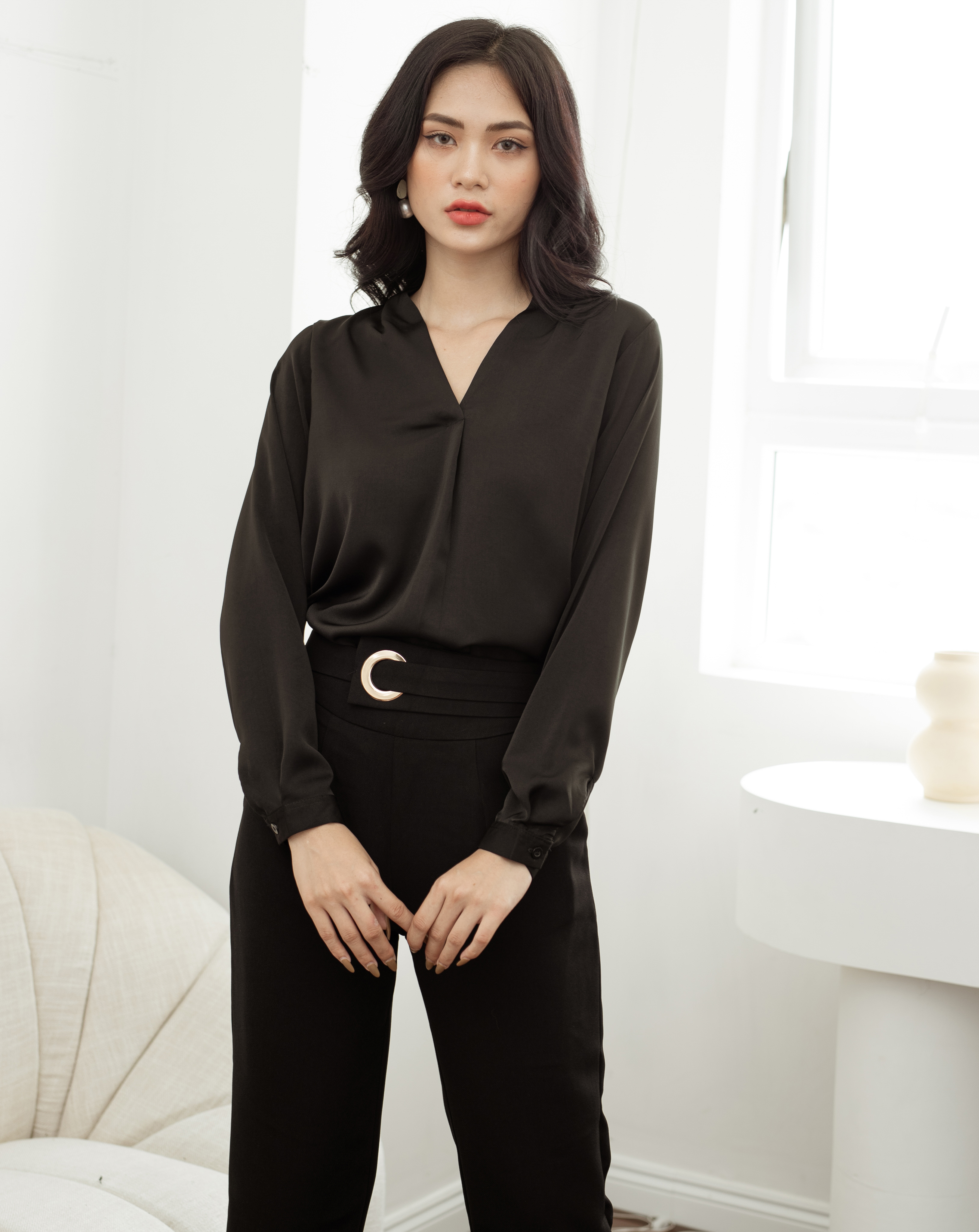 Với hai màu sắc chính là đen và xám, giúp tôn lên nét sang trọng và đa dạng cho người mặc. Kiểu dáng áo cổ V truyền thống, kết hợp với tay dài, tạo nên sự trẻ trung và nữ tính. Áo kiểu có form dáng công sở, giúp tạo điểm nhấn lịch sự và chuyên nghiệp khi mặc trong môi trường văn phòng.