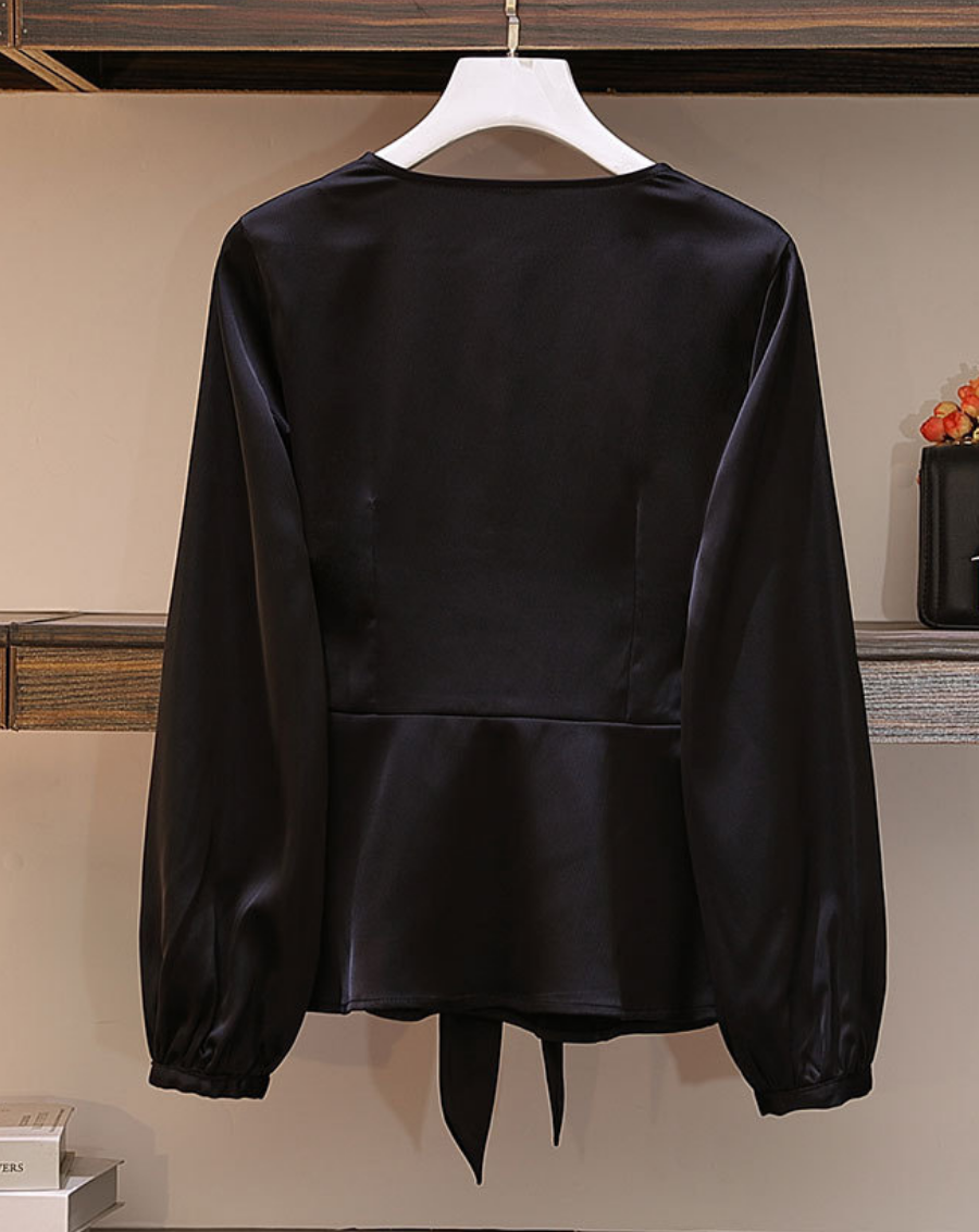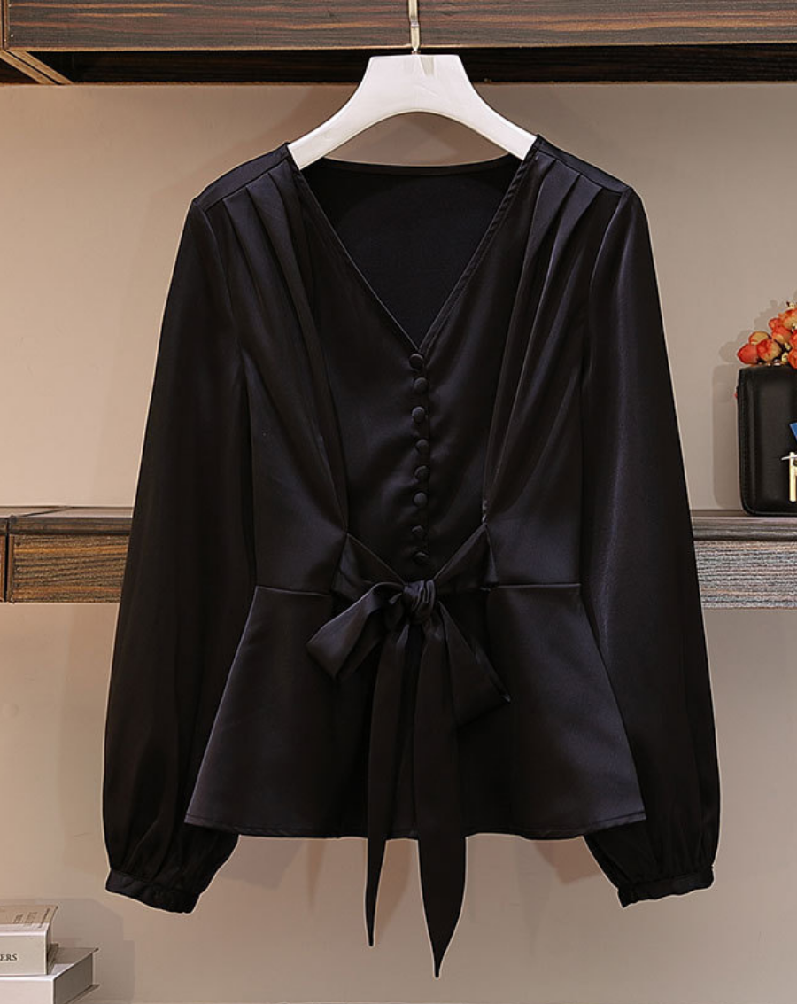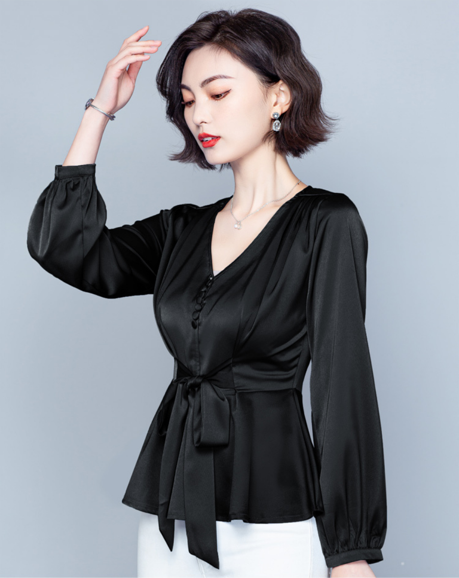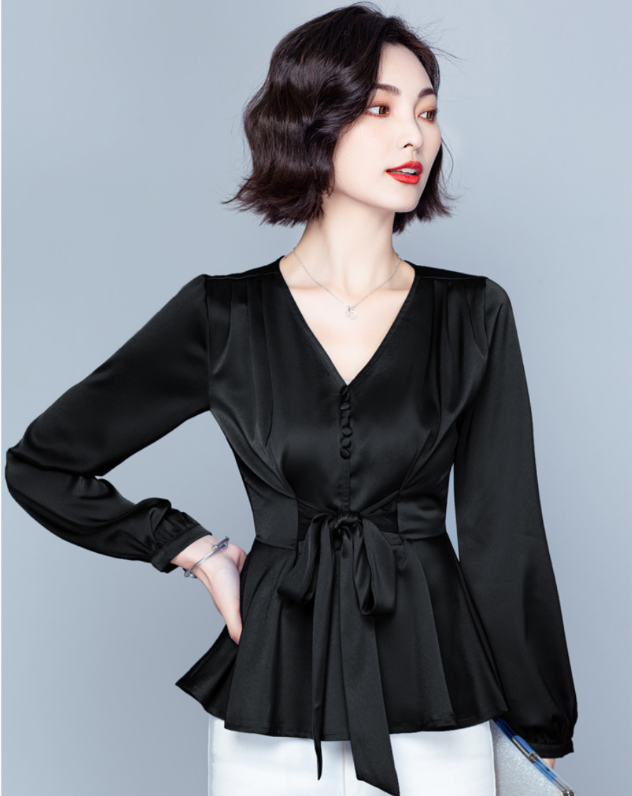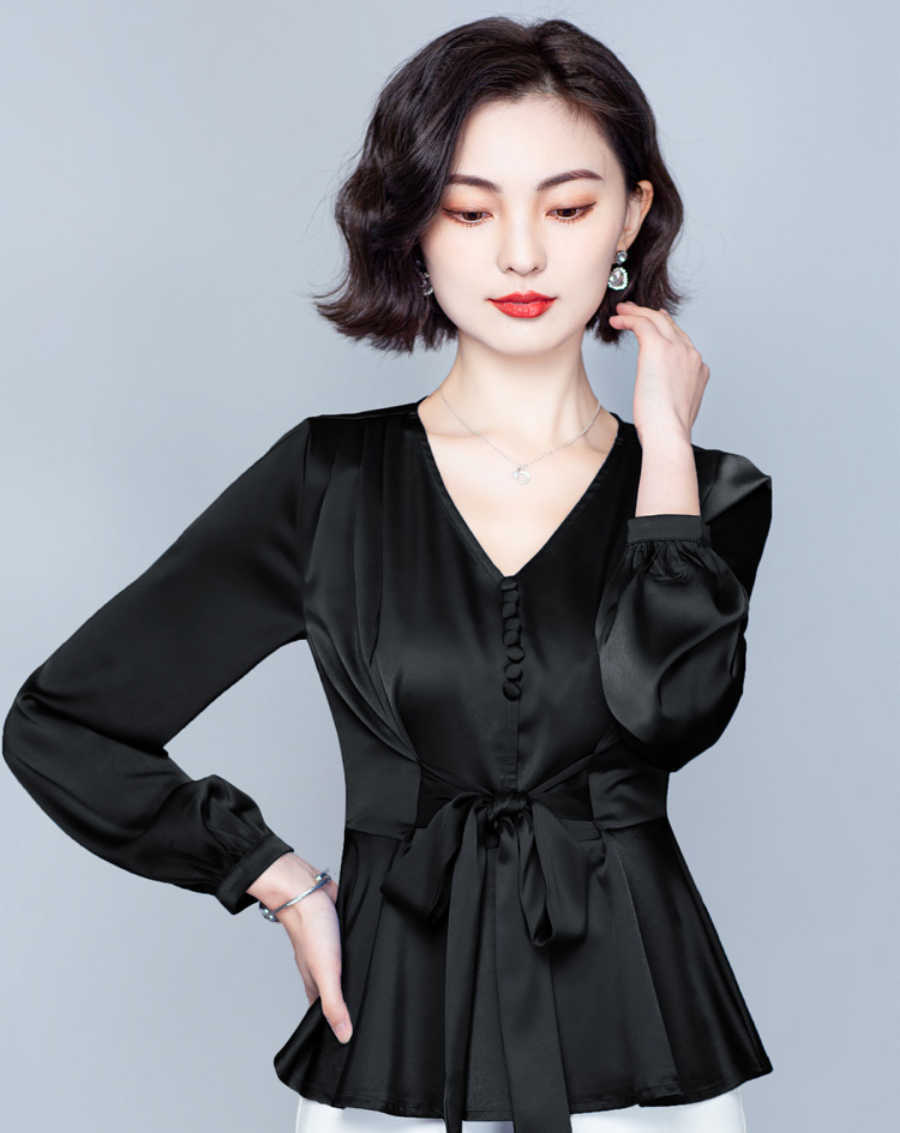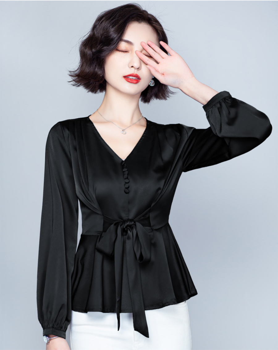 Kiểu dáng áo kiểu peplum cổ V tay dài phối nút cột eo, tạo điểm nhấn đáng yêu và quyến rũ. Cổ V tôn lên vẻ gợi cảm và nữ tính, tay dài mang đến sự ấm áp và phong cách. Việc cột eo giúp tạo nét thon gọn và nữ tính cho vòng eo. Thiết kế peplum tạo hiệu ứng bèo nhẹ nhàng, làm nổi bật phần dưới của áo và tạo nên vẻ nữ tính đáng yêu.