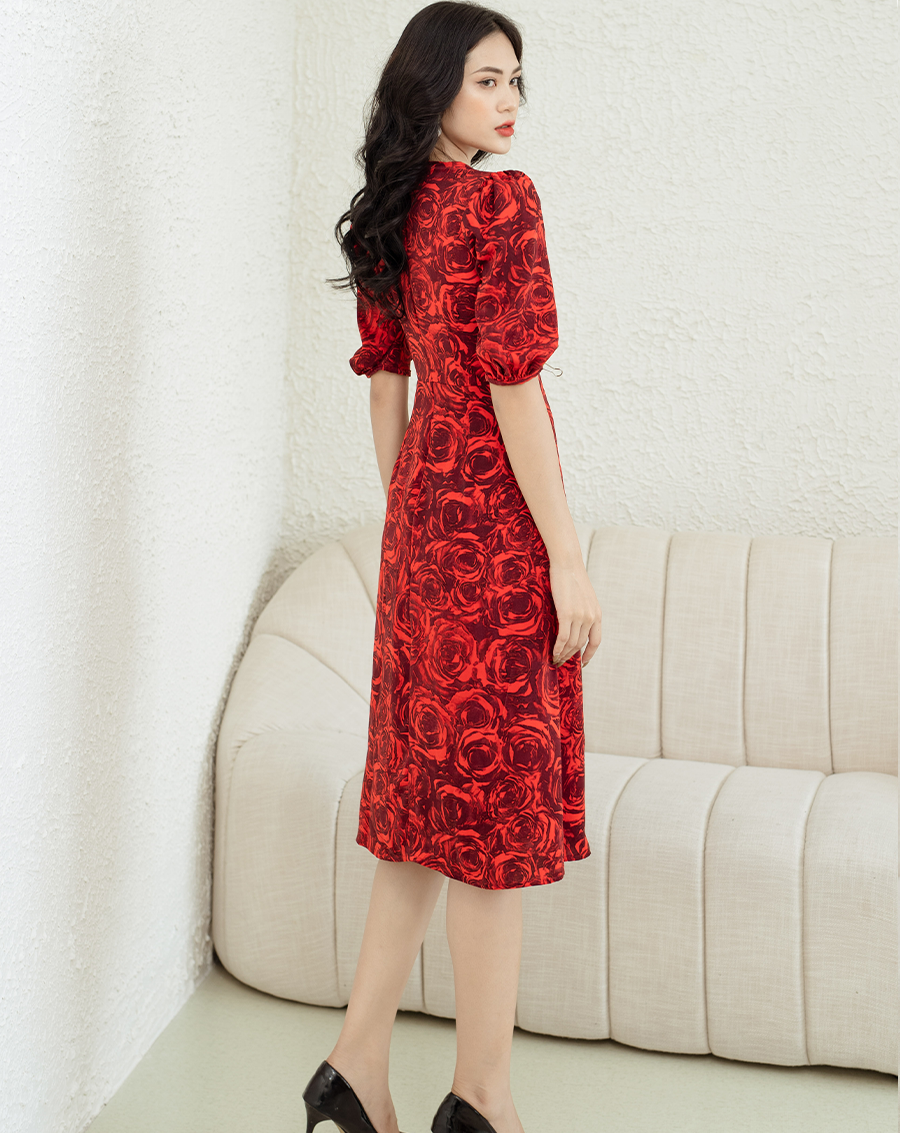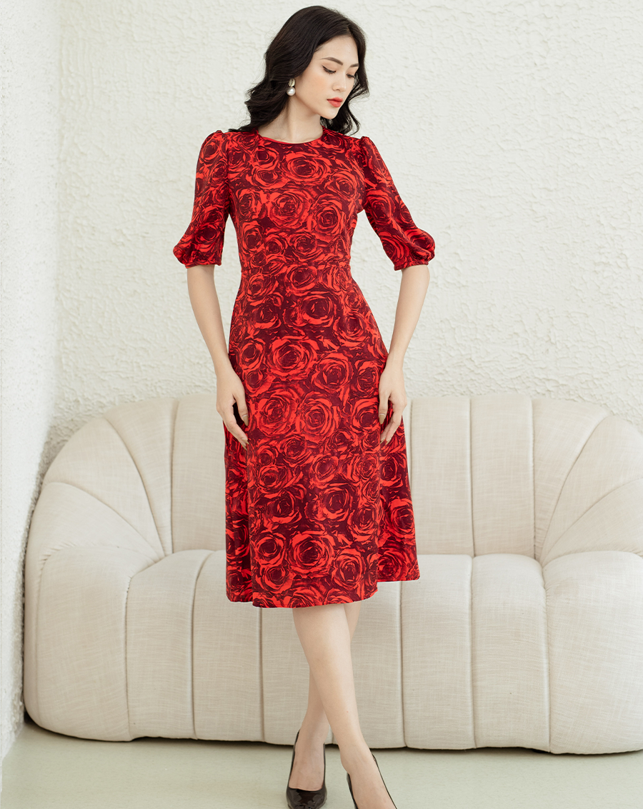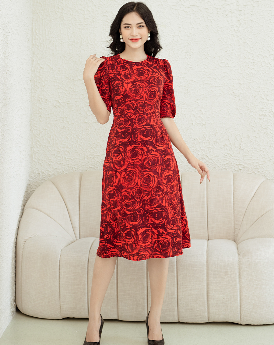 Đầm chữ A hoạ tiết tay bồng