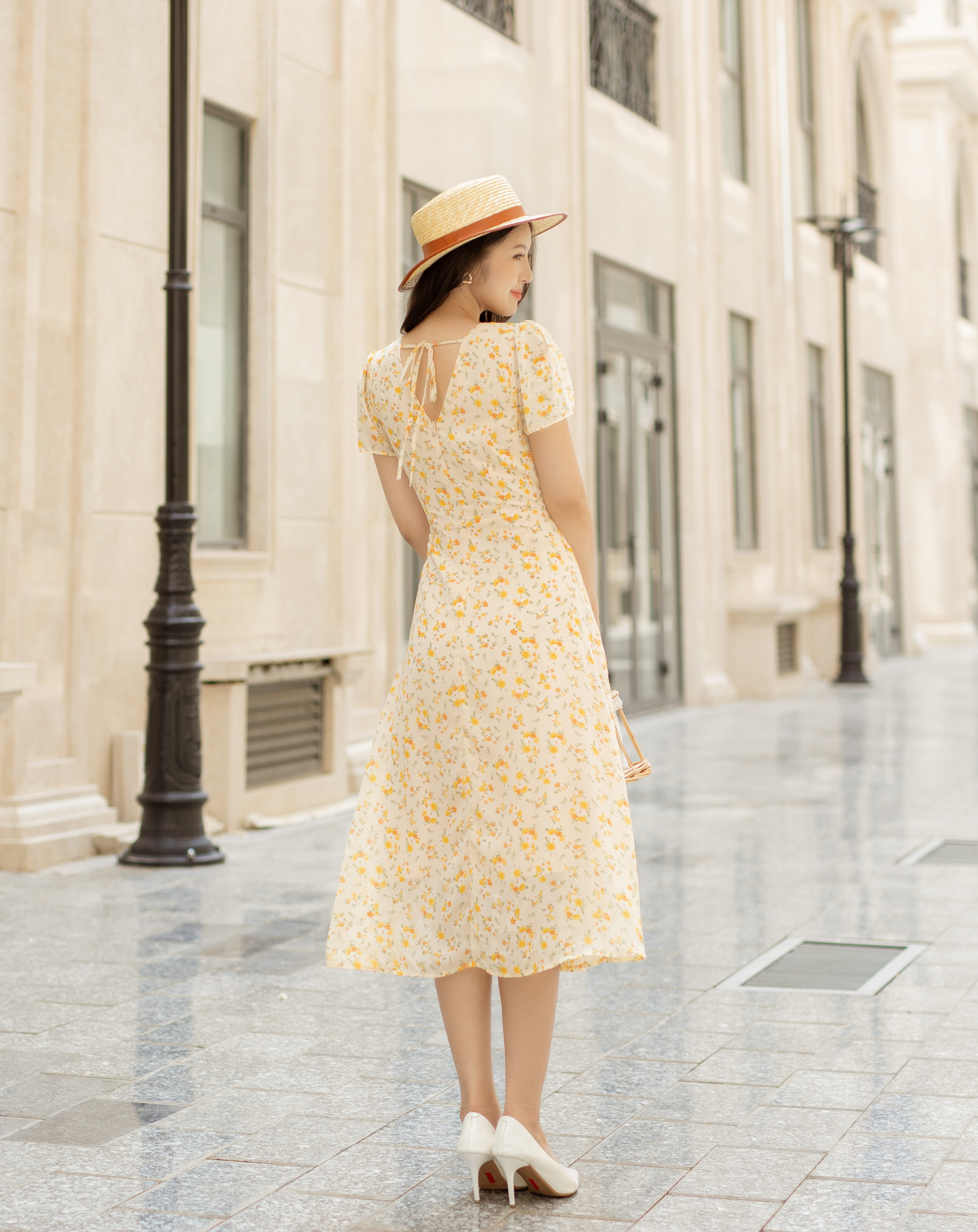 Màu sắc Đầm công sở họa tiết cổ V tươi sáng và trẻ trung với kiểu dáng đầm xòe với cổ V làm tôn lên vẻ nữ tính và quyến rũ. Đường xòe của đầm tạo cảm giác nhẹ nhàng và thoải mái, mang lại sự tự tin.