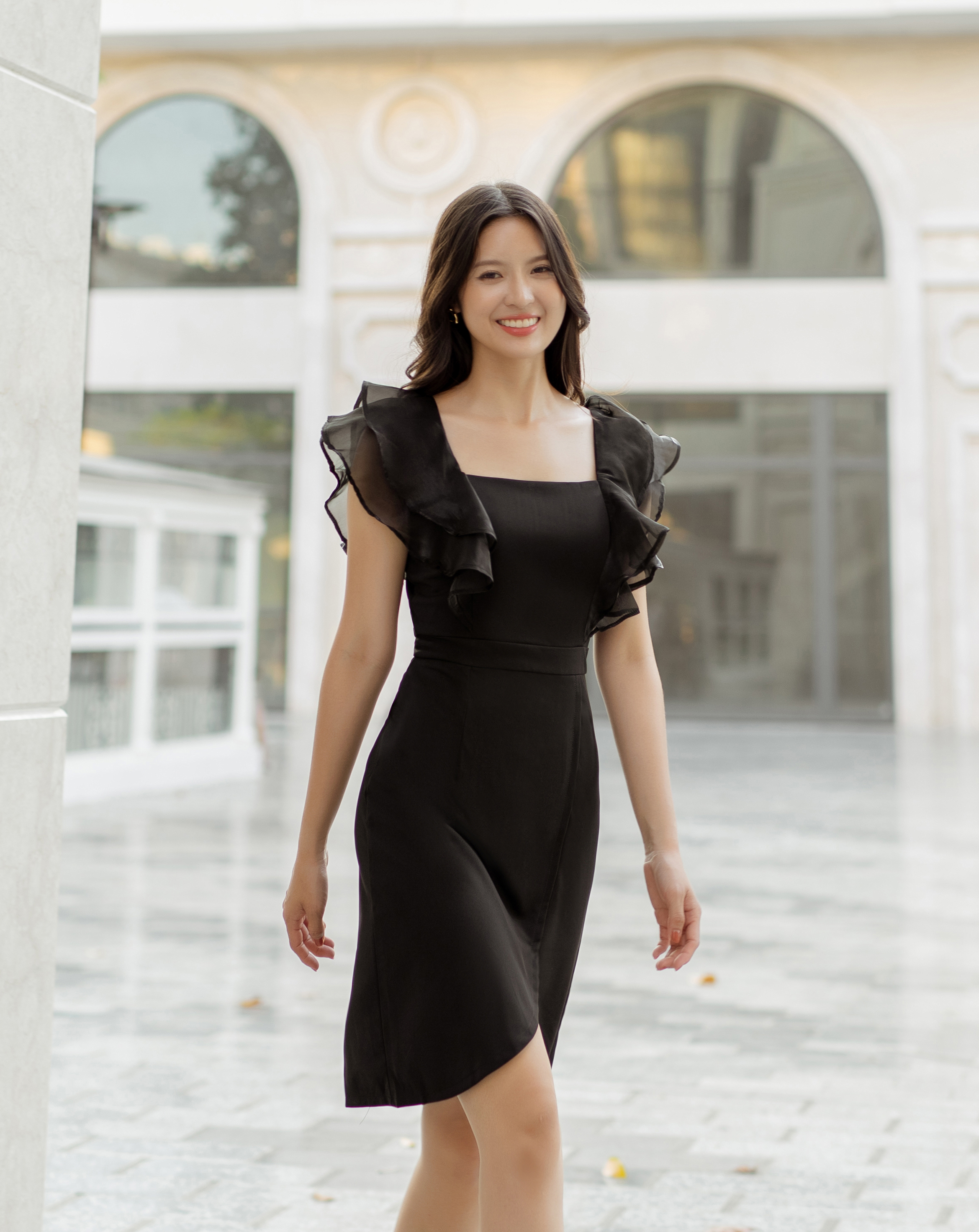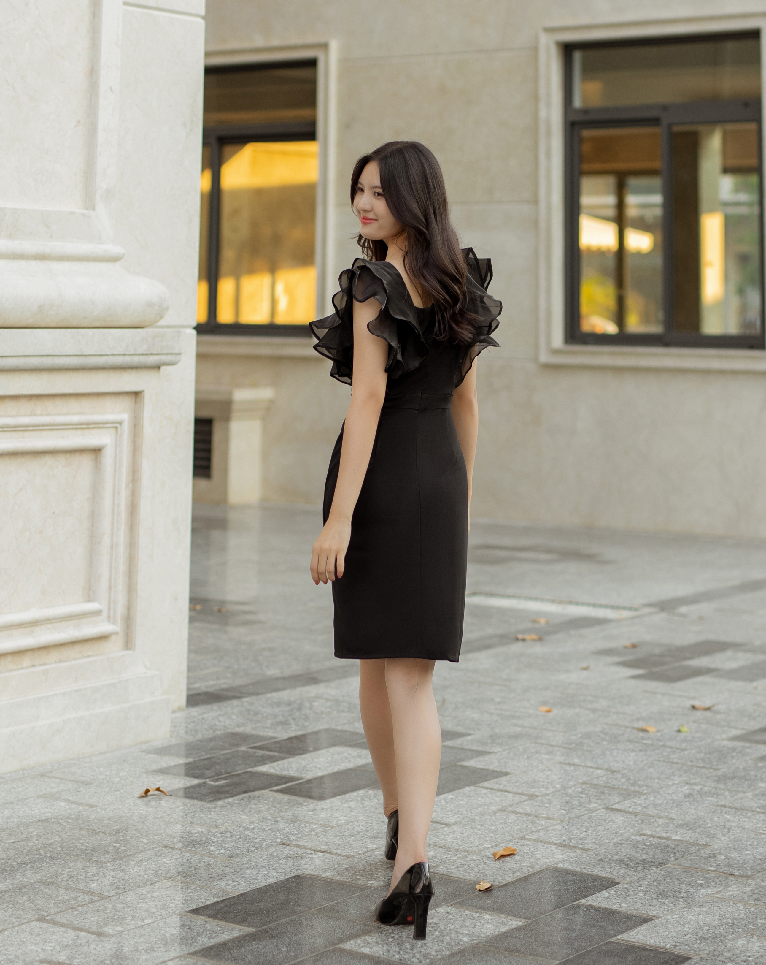Kiểu dáng của đầm ôm body, giúp tôn lên đường cong cơ thể và tạo nên sự gợi cảm. Bèo được phối ở cổ U, tạo điểm nhấn đặc biệt và thêm vào sự nữ tính và quyến rũ của Đầm dự tiệc. Được làm từ chất liệu lụa hà lan phối organza, sản phẩm mang lại vẻ mềm mại và sang trọng. Màu sắc chủ đạo của đầm là màu đen, tạo nên sự lịch lãm và trang nhã.