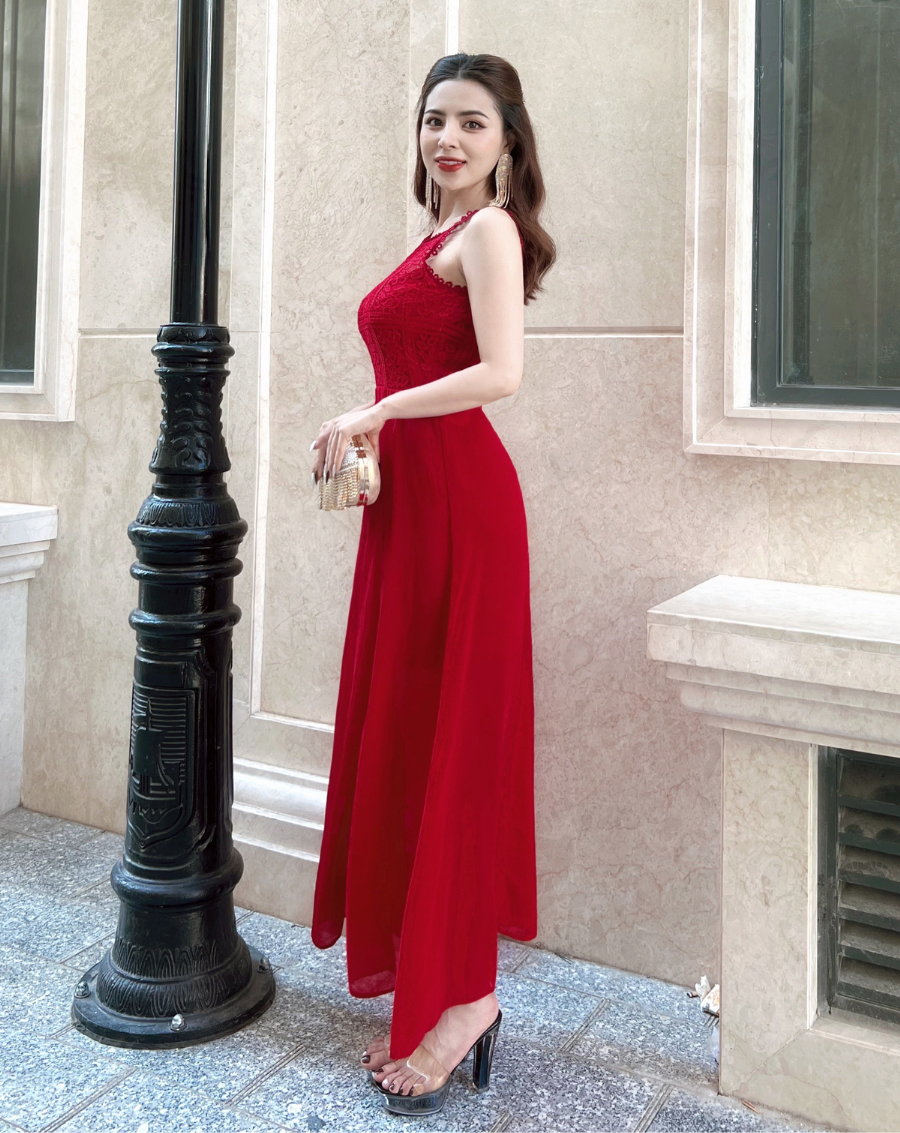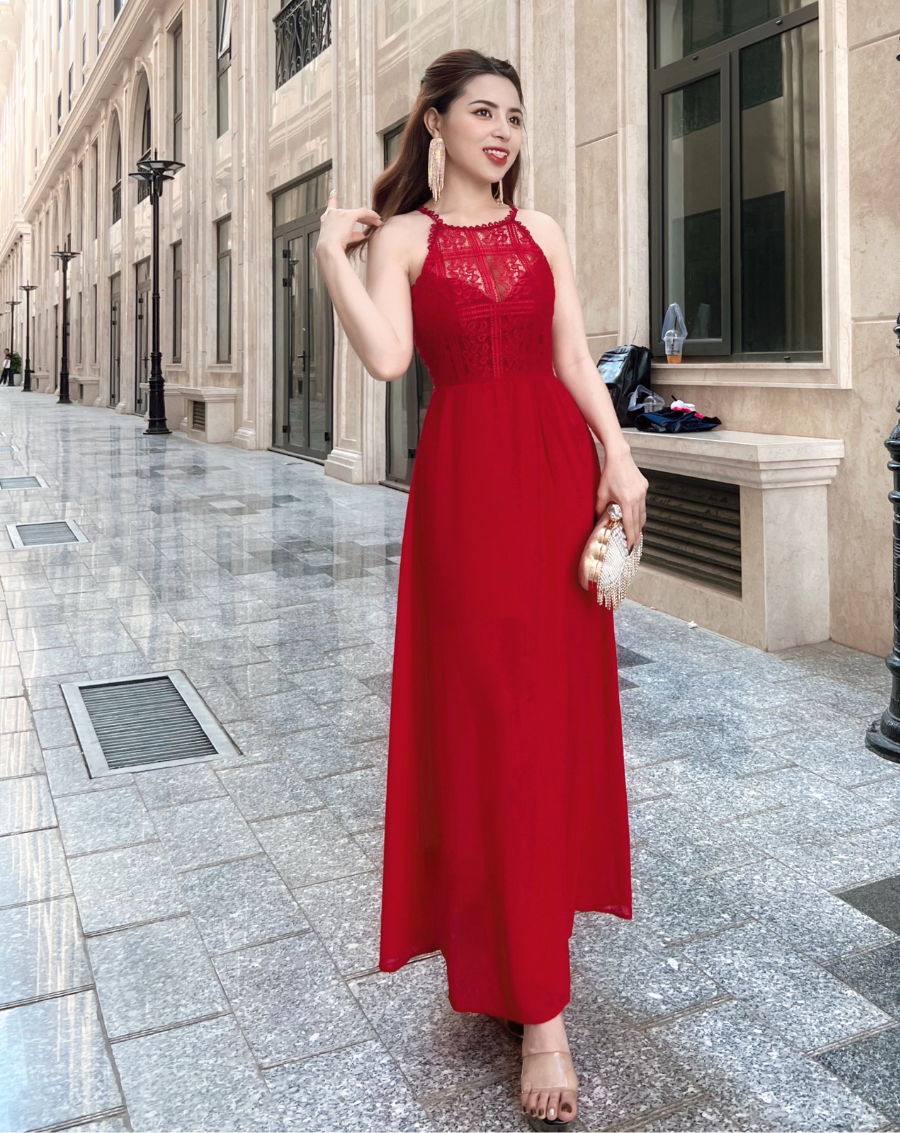 Đầm maxi cổ yếm phối ren xẻ tà có sẵn trong ba màu sắc đen, đỏ và xanh đen, tạo ra sự lựa chọn đa dạng và phù hợp với nhiều sở thích và phong cách cá nhân.