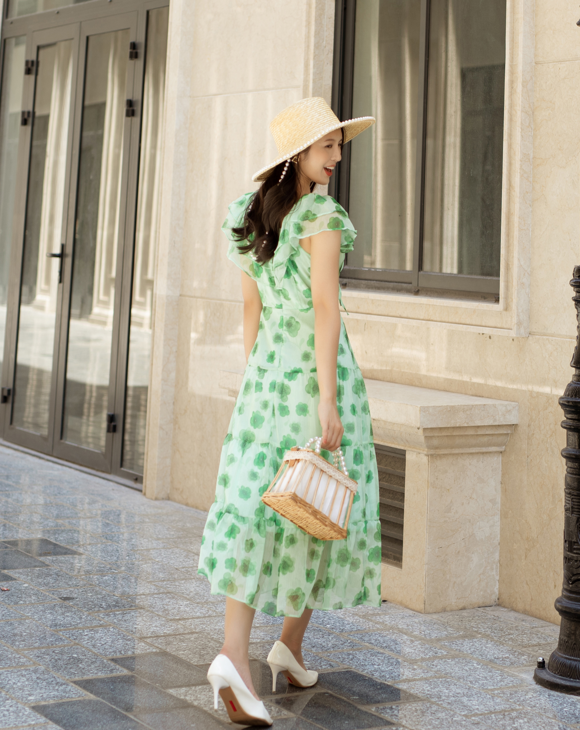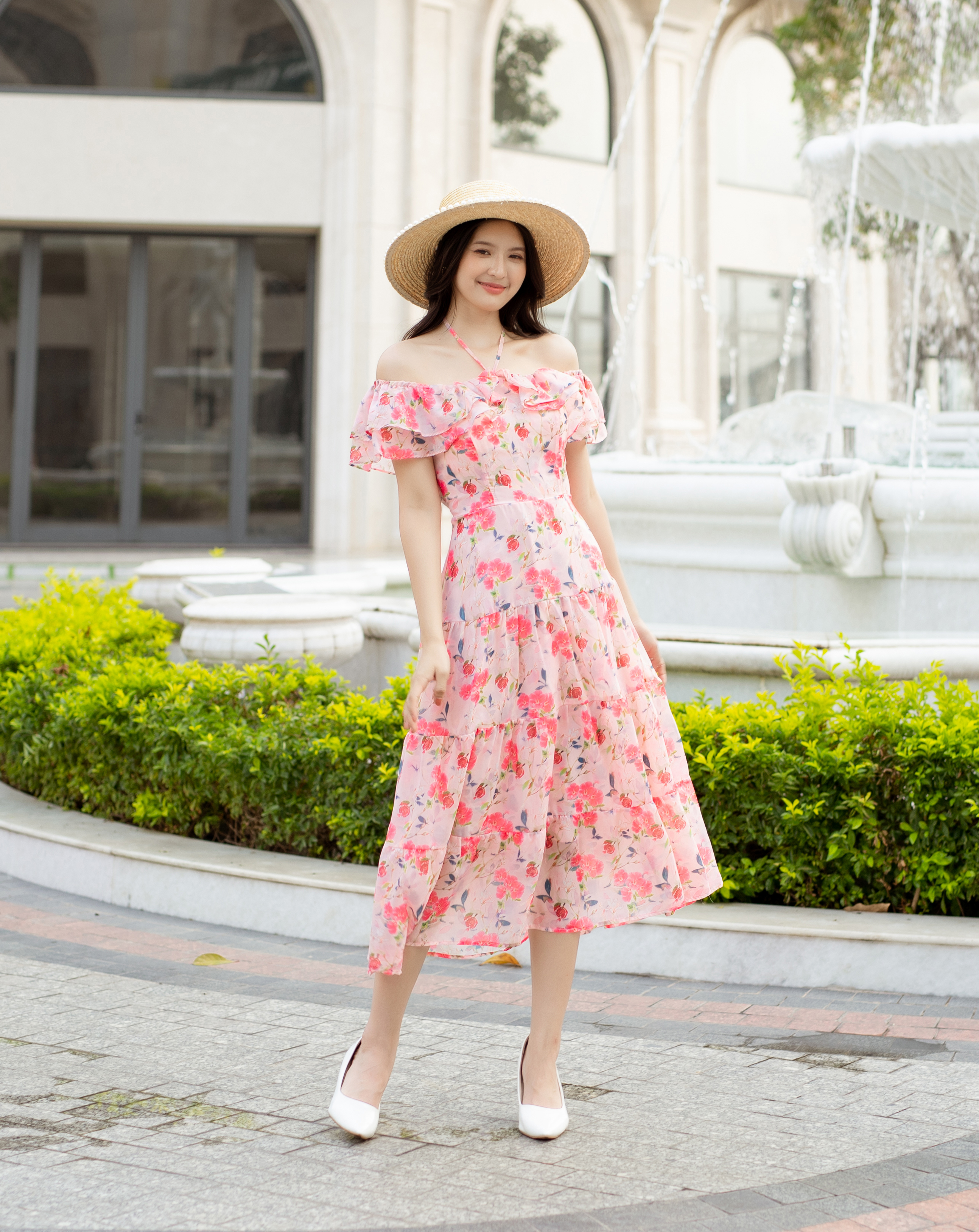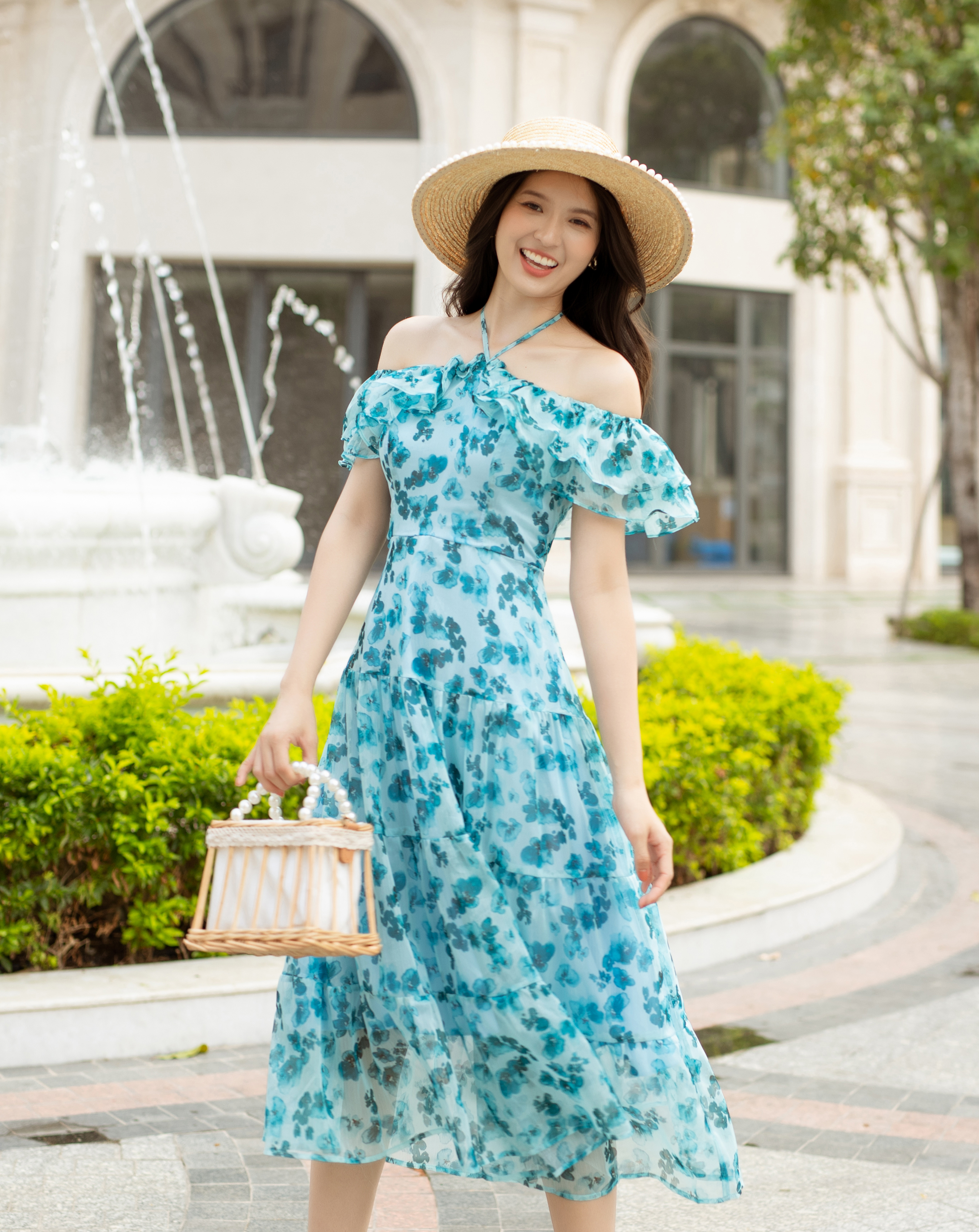 Kiểu dáng đầm maxi hoa xèo với trễ vai và bèo cột nơ xinh xắn. Thiết kế này không chỉ giúp quý cô khéo léo che mọi khuyết điểm mà còn tạo nên điểm nhấn đáng yêu và duyên dáng cho bộ trang phục.
