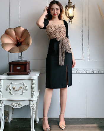 Đầm thiết kế phối lưới ngực chấm bi thắt nơ eo