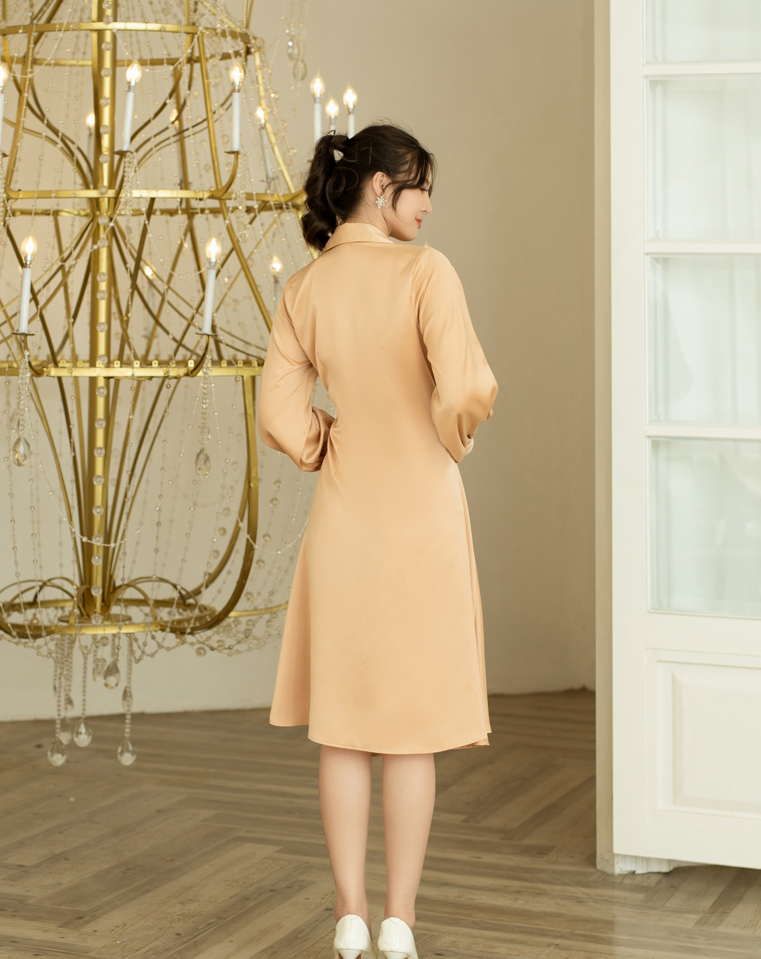 Điểm nổi bật của Đầm xoè này là cổ sơ mi, mang lại vẻ thanh lịch và trang nhã. Cổ áo sơ mi được thiết kế cẩn thận, tạo nét gọn gàng và chuyên nghiệp. Tay dài của đầm cũng thêm vào phần nữ tính và tinh tế.