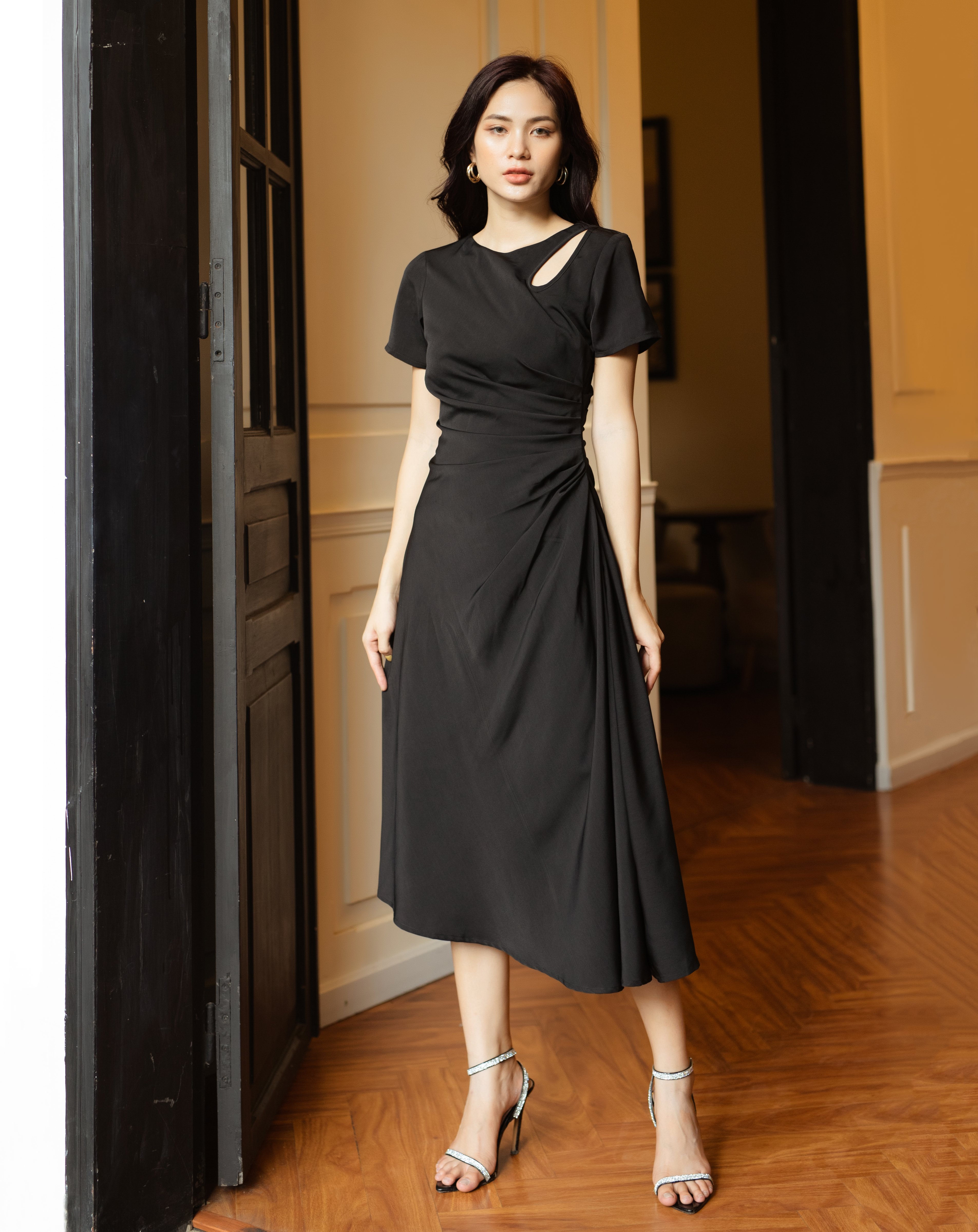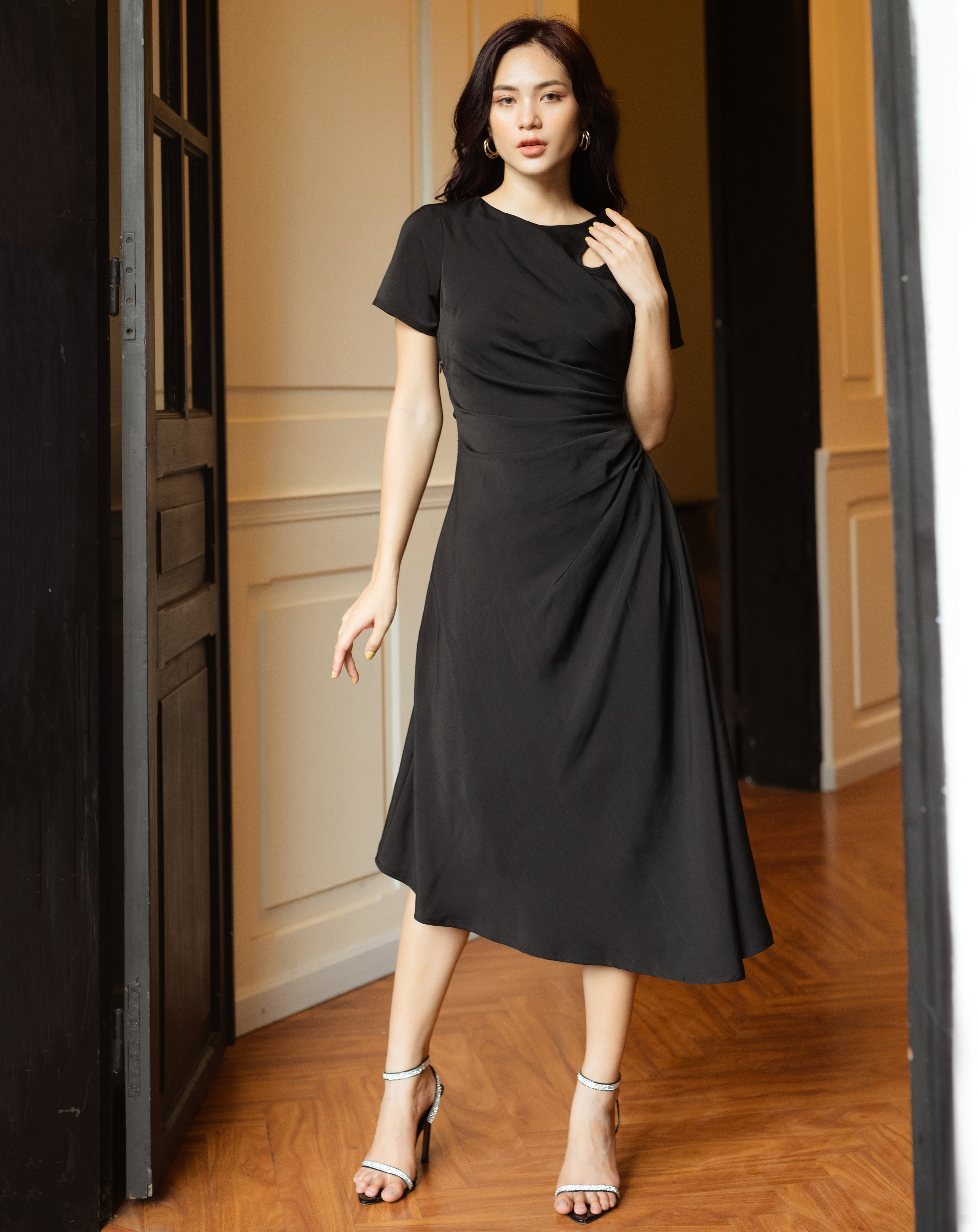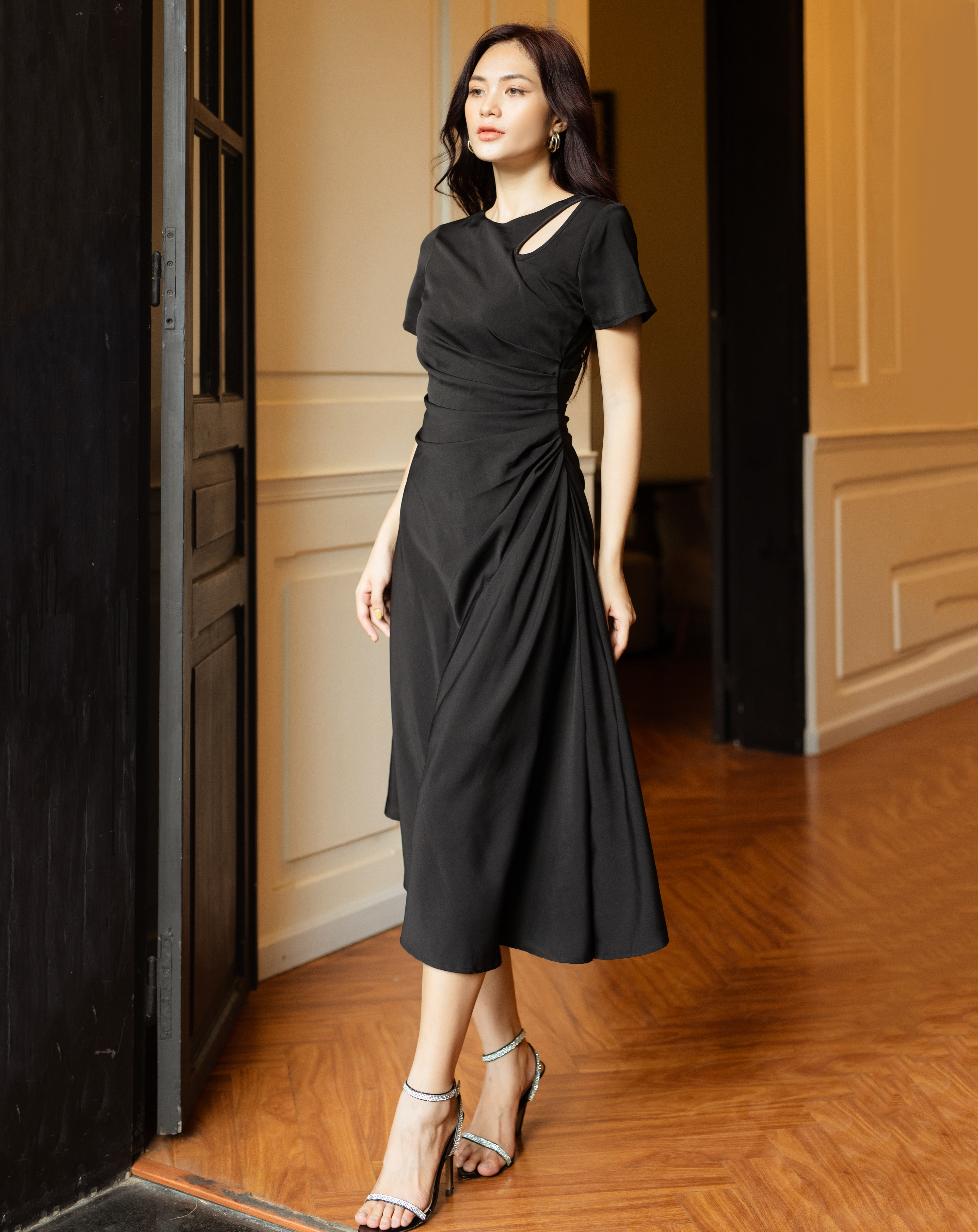 Thiết kế dáng váy dài mang lại sự nữ tính và quyến rũ, trong khi tay con xếp ly eo và cut out giọt nước tạo điểm nhấn độc đáo và thu hút ánh nhìn.