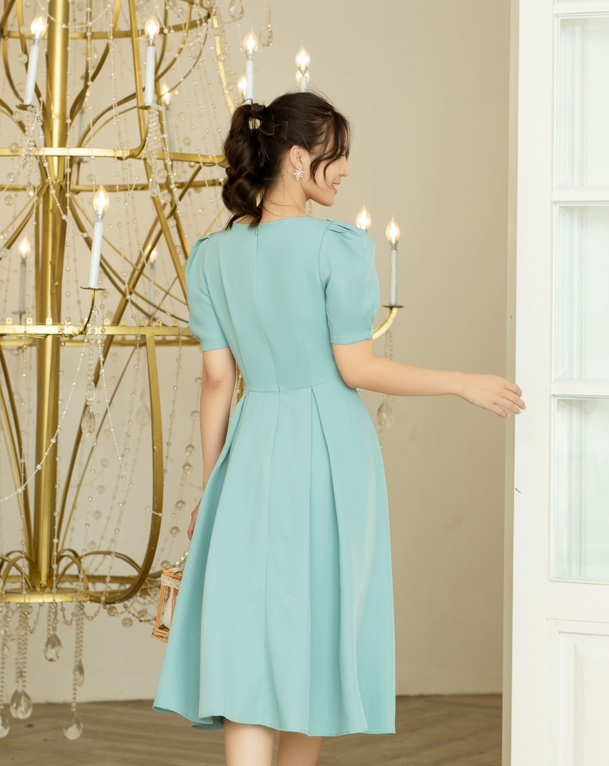 Màu sắc xanh tươi tạo nên sự tươi trẻ và thu hút ánh nhìn. Kiểu dáng Đầm xòe qua gối với các lớp xếp ly tạo nên vẻ thanh lịch và nữ tính. Đặc biệt, kiểu cổ U đính nút đá tinh tế và sang trọng, tôn lên vẻ đẹp và sự quyến rũ cho nàng. Ngoài ra, đầm còn được phối thêm nơ đính hoa đá, mang đến điểm nhấn quyến rũ và thu hút.