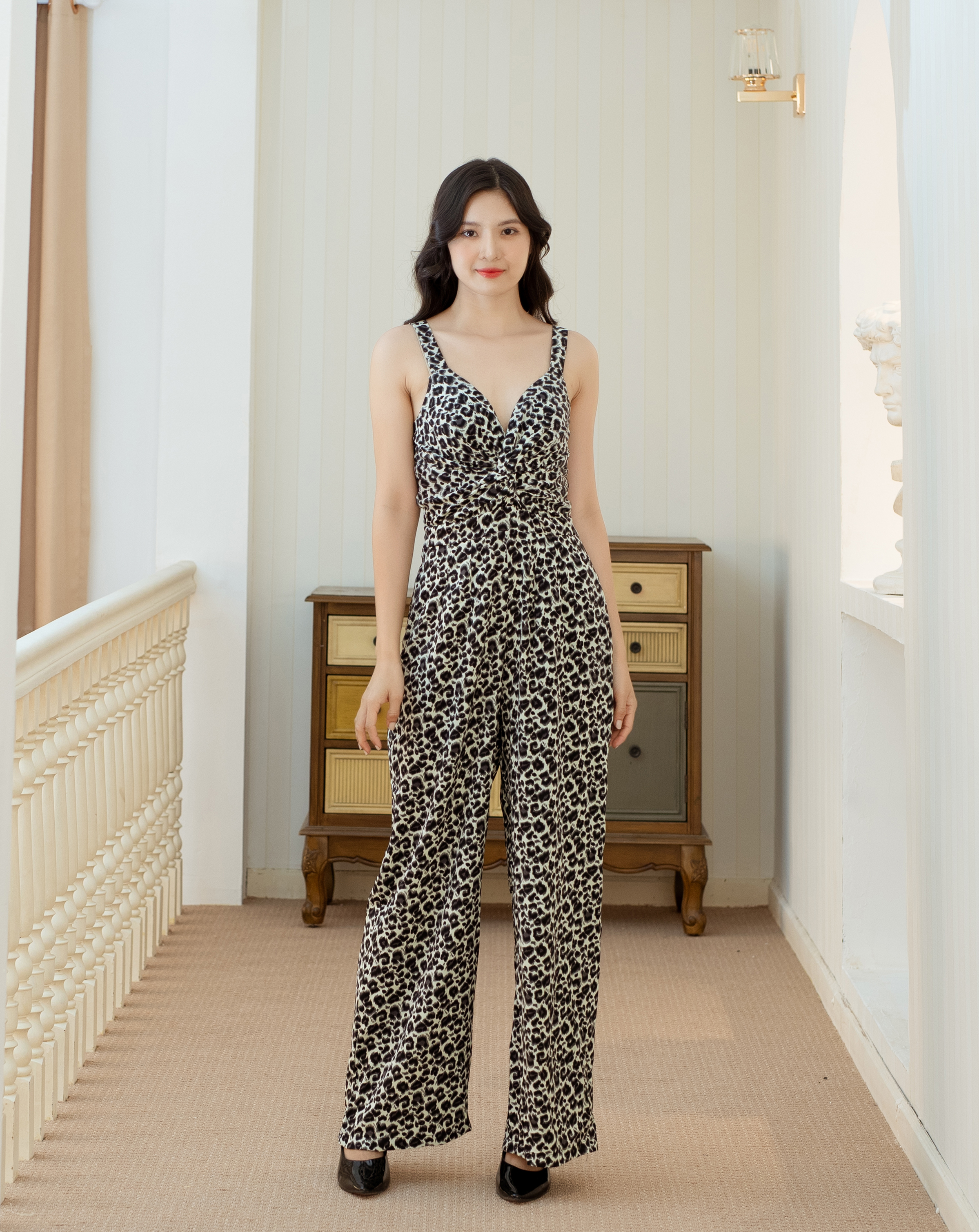 Bộ Jumpsuit thiết kế hoạ tiết này được thiết kế tạo nên vẻ đẹp liền mạch và sang trọng. Điều này tạo nên sự kết hợp giữa phong cách cổ điển và hiện đại, mang lại một vẻ ngoài độc đáo và thời thượng.