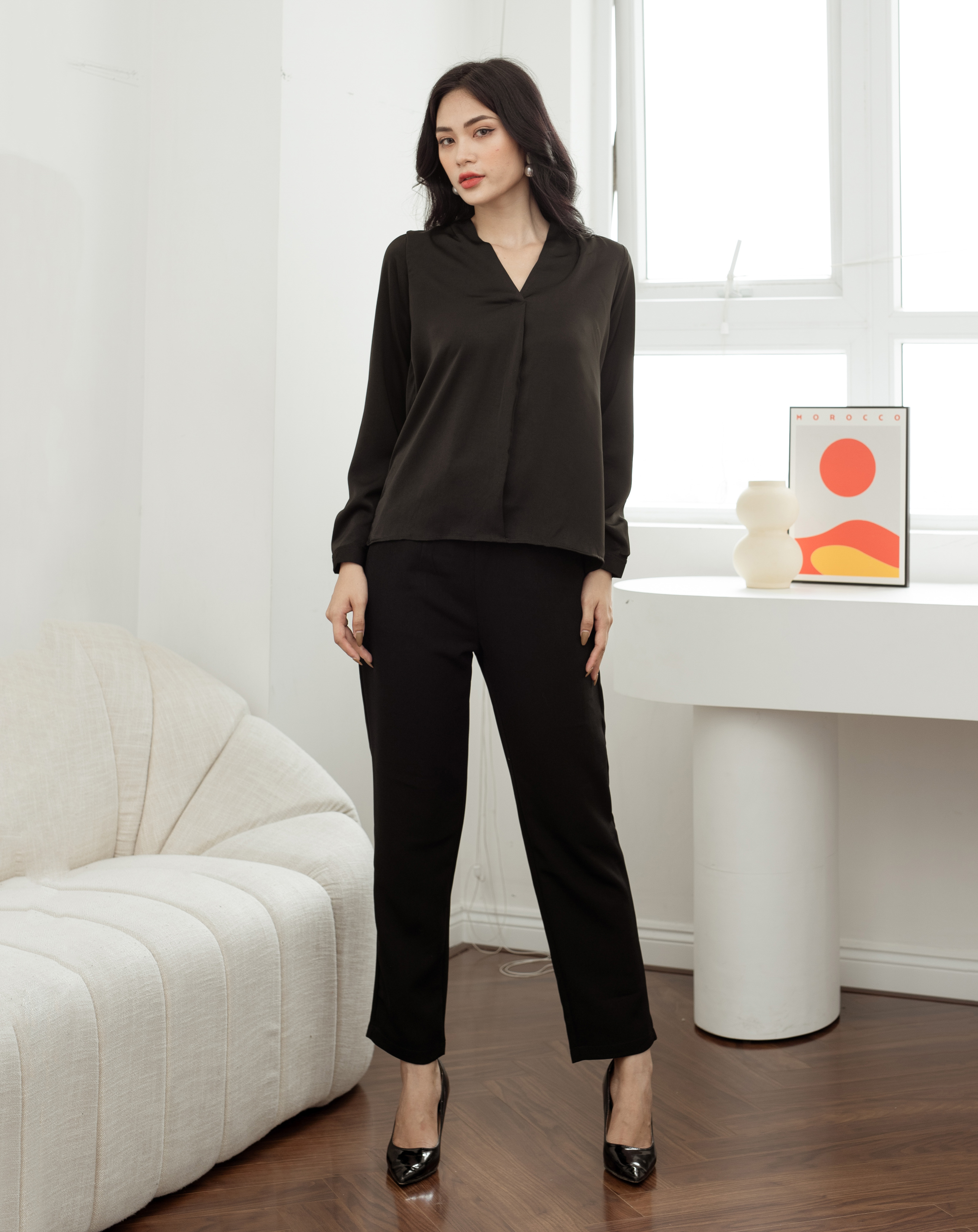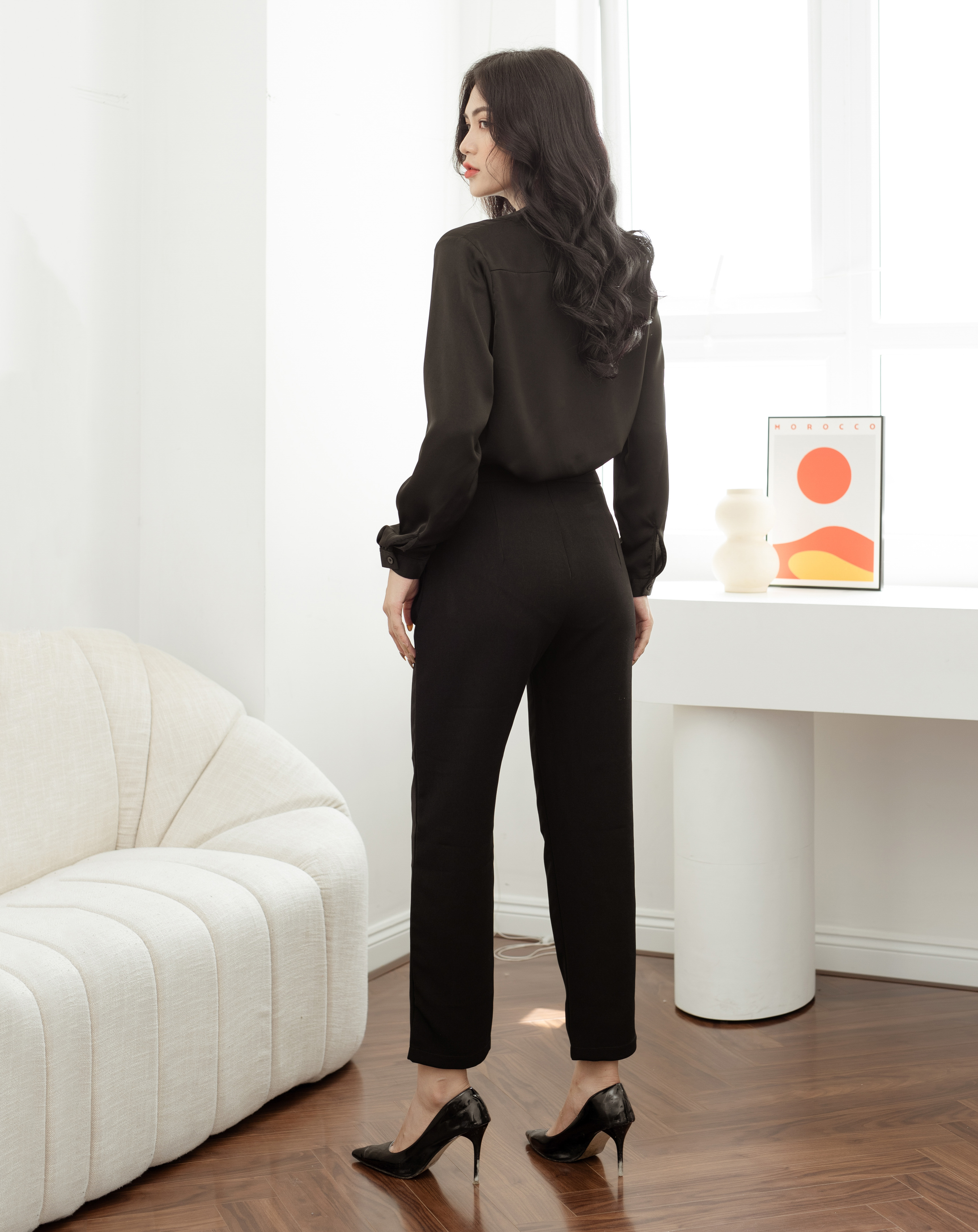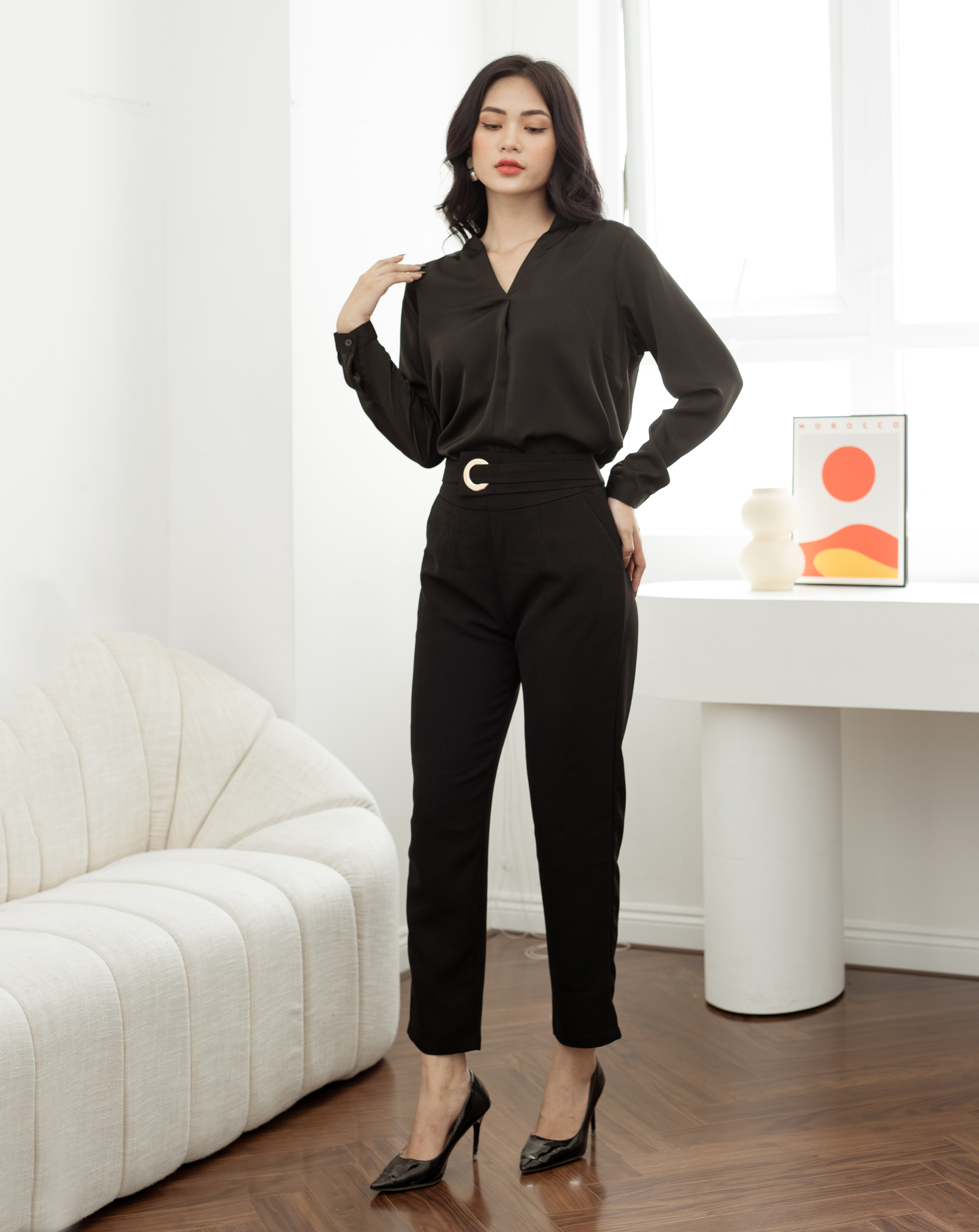 Với quần lưng cao gắn khoen tròn, bạn có thể tạo nên nhiều trang phục khác nhau, kết hợp với áo sơ mi, áo blouse hoặc áo thun để tạo nên phong cách công sở chuyên nghiệp. Đồng thời, nó cũng phù hợp cho các hoạt động giải trí và thư giãn ngoài công việc.