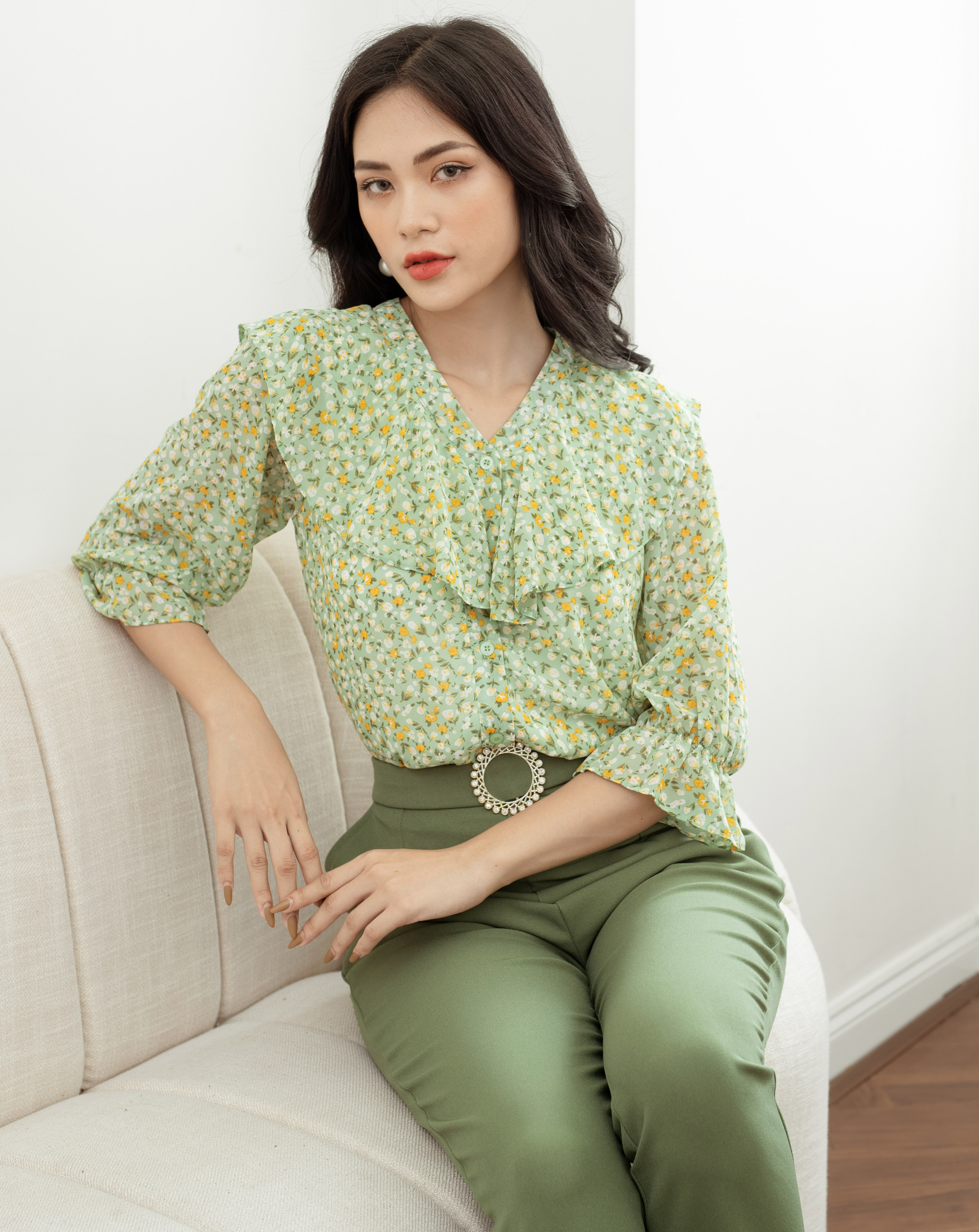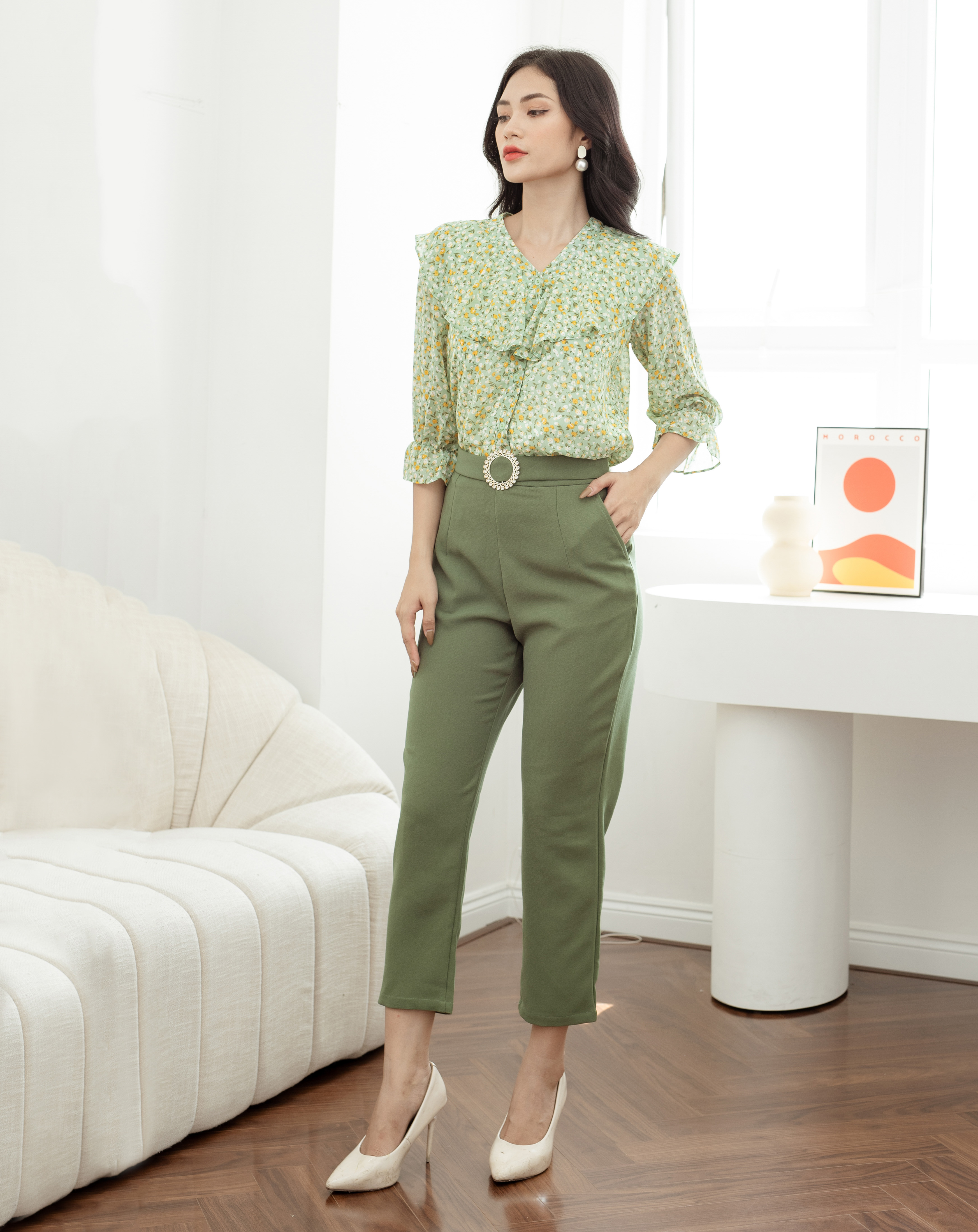 Màu xanh thanh lịch mang đến vẻ trẻ trung và tươi mới cùng kiểu dáng áo có tay và phối quần dài lưng cao tạo nên vẻ đẹp thanh thoát và nữ tính. Với hoa văn trên áo, Set bộ phong cách này thích hợp cho các buổi làm việc công sở, dự tiệc, party, event hoặc thậm chí đi chơi.