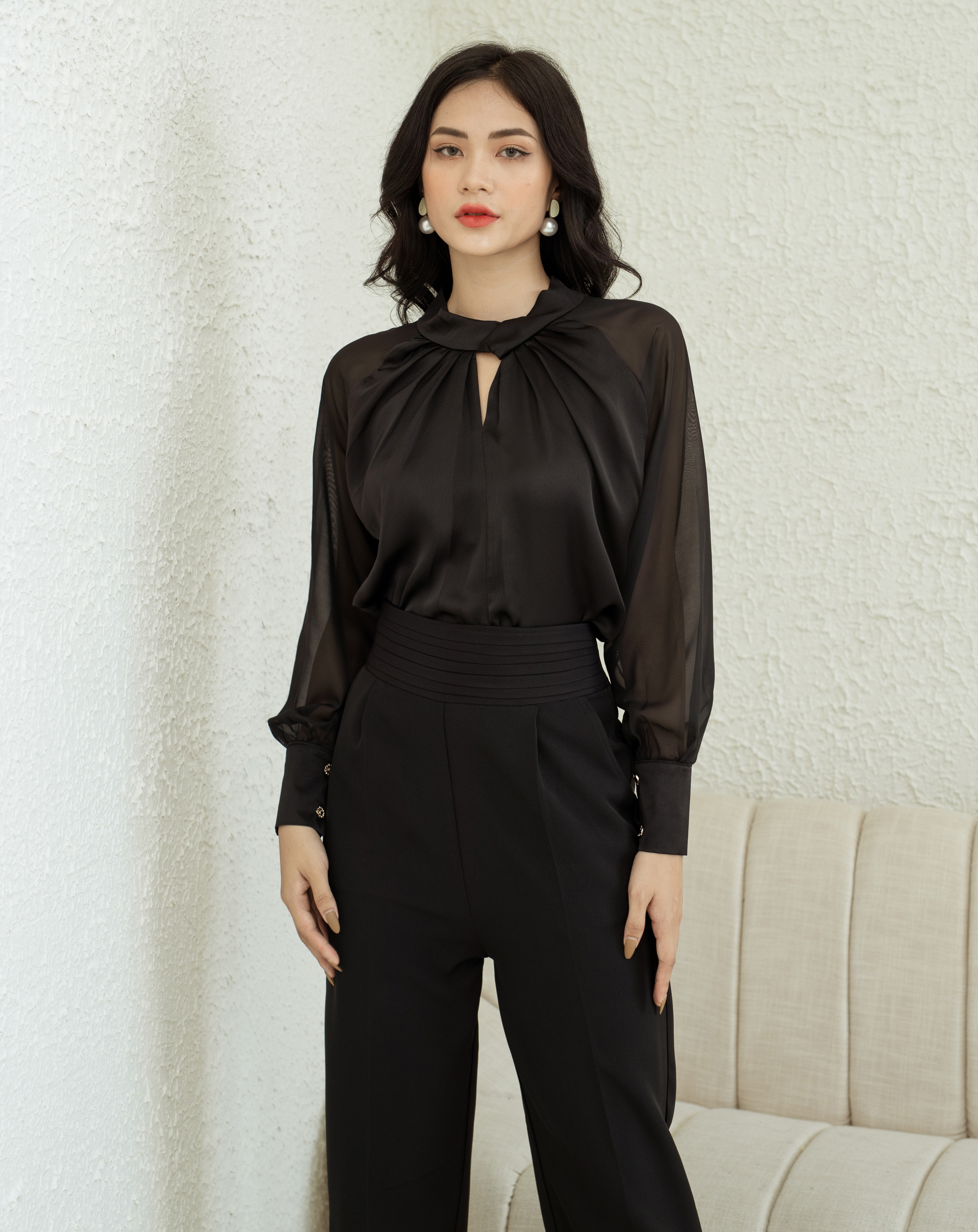Set bộ áo có màu sắc đen, tạo nên một diện mạo thanh lịch, sang trọng và dễ dàng kết hợp với các phụ kiện và trang phục khác. Kiểu dáng của sản phẩm bao gồm áo kiểu có tay dài và quần lưng cao. Áo có kiểu dáng kiểu cách, giúp tôn lên vẻ đẹp và sự tự tin của người mặc. Quần có lưng cao, giúp che khuyết điểm và tạo nên vòng eo thon gọn.