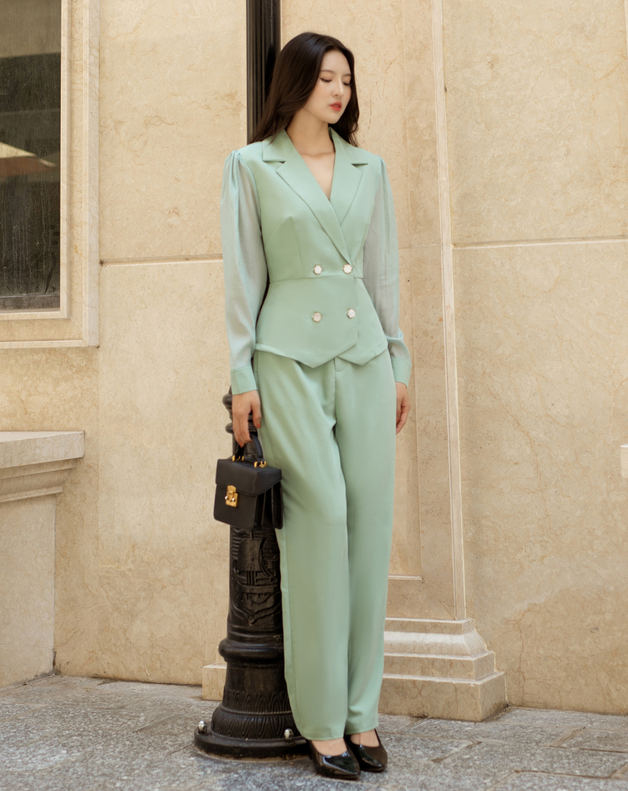 Kiểu dáng phối tay đơn giản kết hợp với form quần tây ống đứng, mang lại vẻ thanh lịch và trang nhã. Set bộ này phù hợp để mặc trong môi trường công sở, đi tiệc hay tham dự các sự kiện.