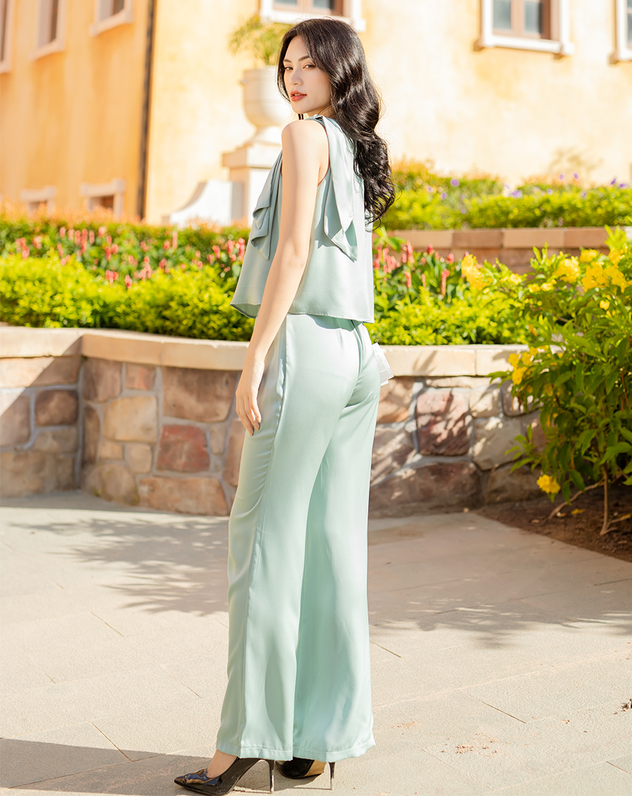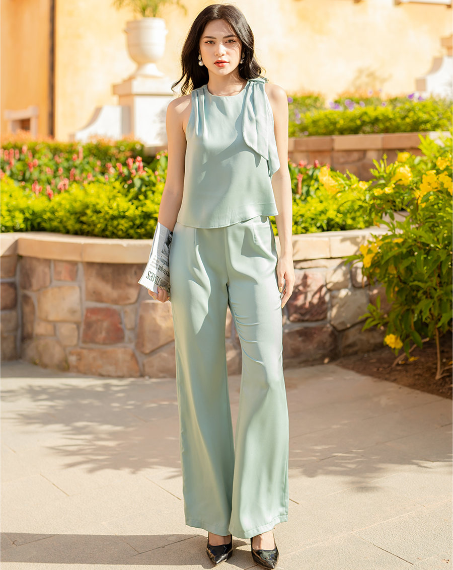 Kiểu dáng áo được thiết kế với nơ trang trí tinh tế, tạo điểm nhấn nữ tính và quyến rũ. Quần dài ống loe tạo ra vẻ thời trang vừa trẻ trung vừa thoải mái.