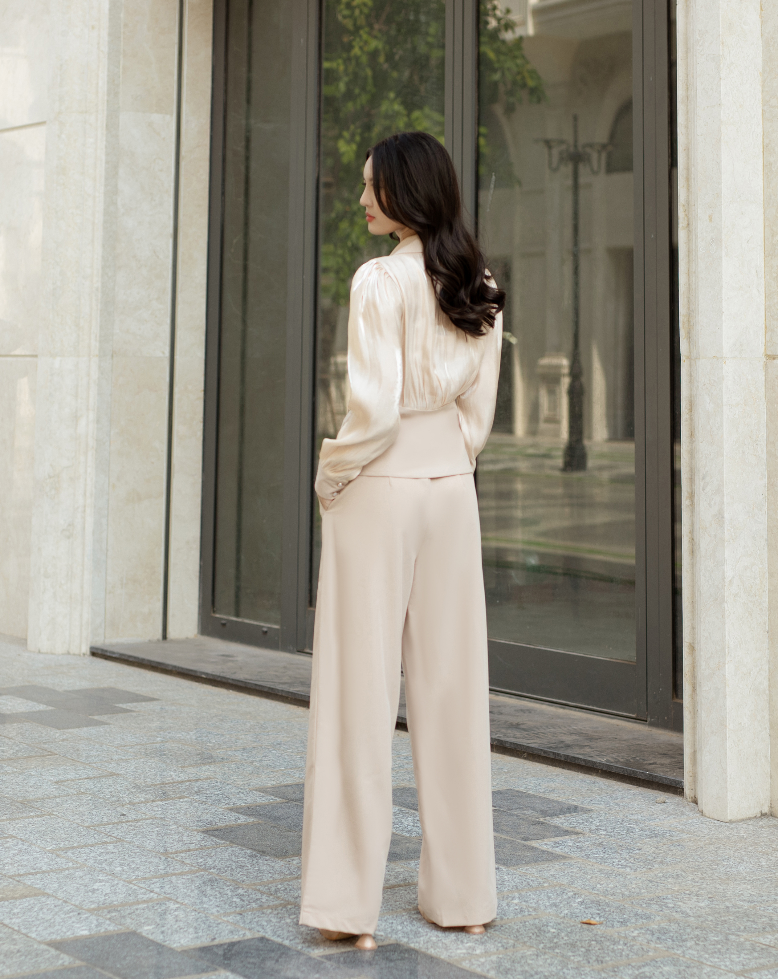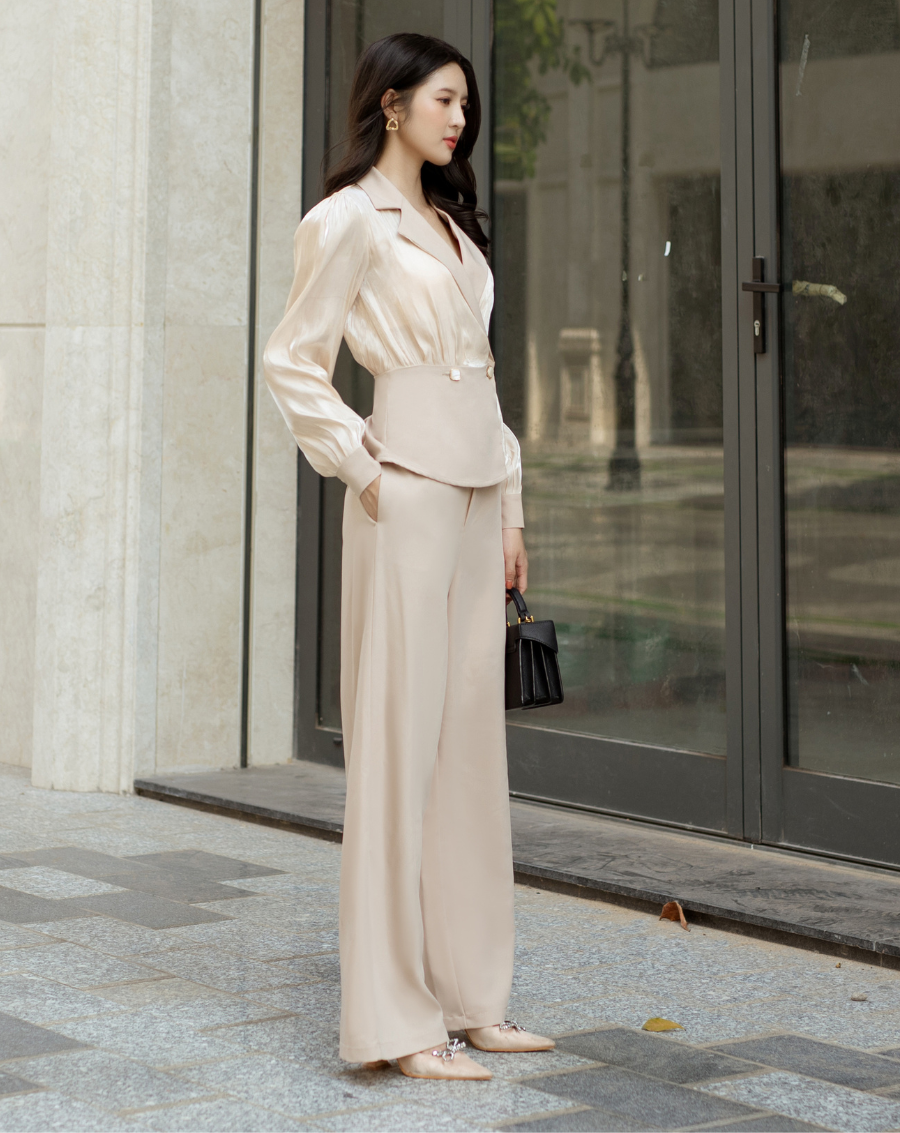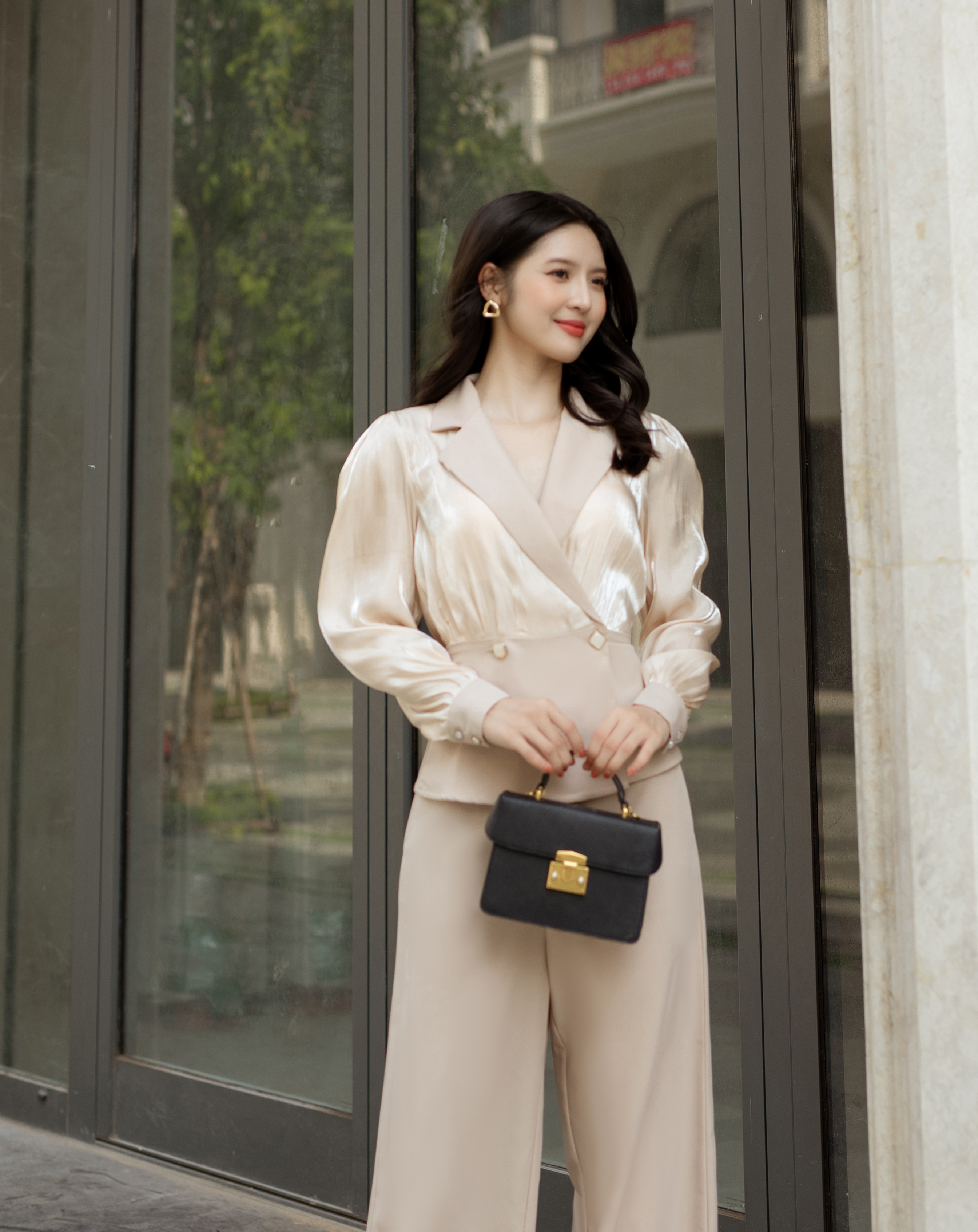 Kiểu dáng áo cổ Vest phối tằm ánh sang trọng và quần dài lưng cao tôn dáng chân dài miên man. Áo cổ Vest phối tằm ánh mang đến vẻ thanh lịch và đẳng cấp, là điểm nhấn cho Set bộ. Quần dài lưng cao tôn dáng chân dài, giúp nàng tự tin và mang đến vẻ thon gọn cho vóc dáng.