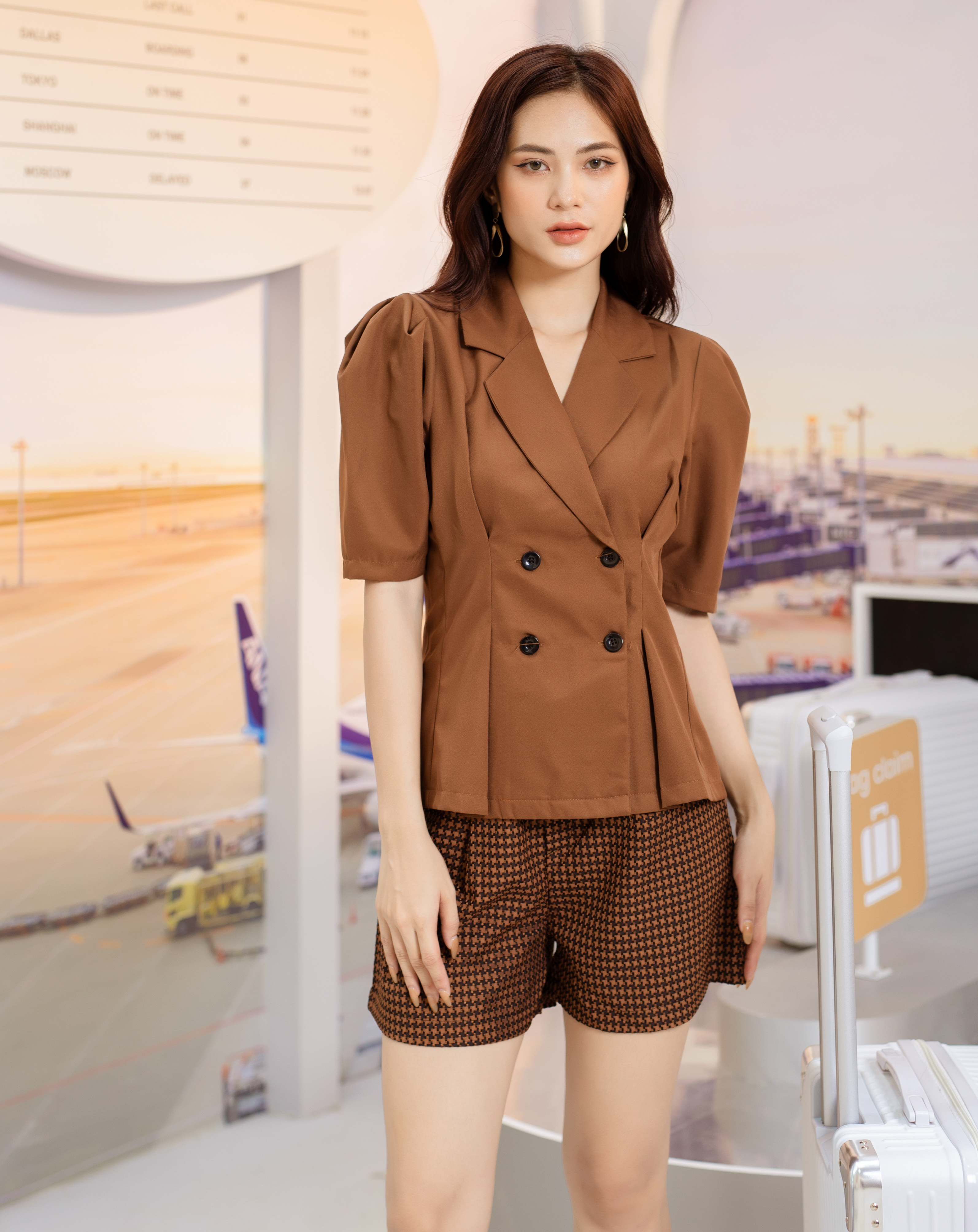Quần short có chiều dài ngắn, tạo cảm giác thoải mái và năng động. Áo vest có thiết kế ngắn tay và cổ áo tròn, tạo điểm nhấn cho trang phục và mang đến vẻ ngoài lịch lãm và tinh tế kết hợp cùng màu nâu tạo nên sự ấm áp và trẻ trung.