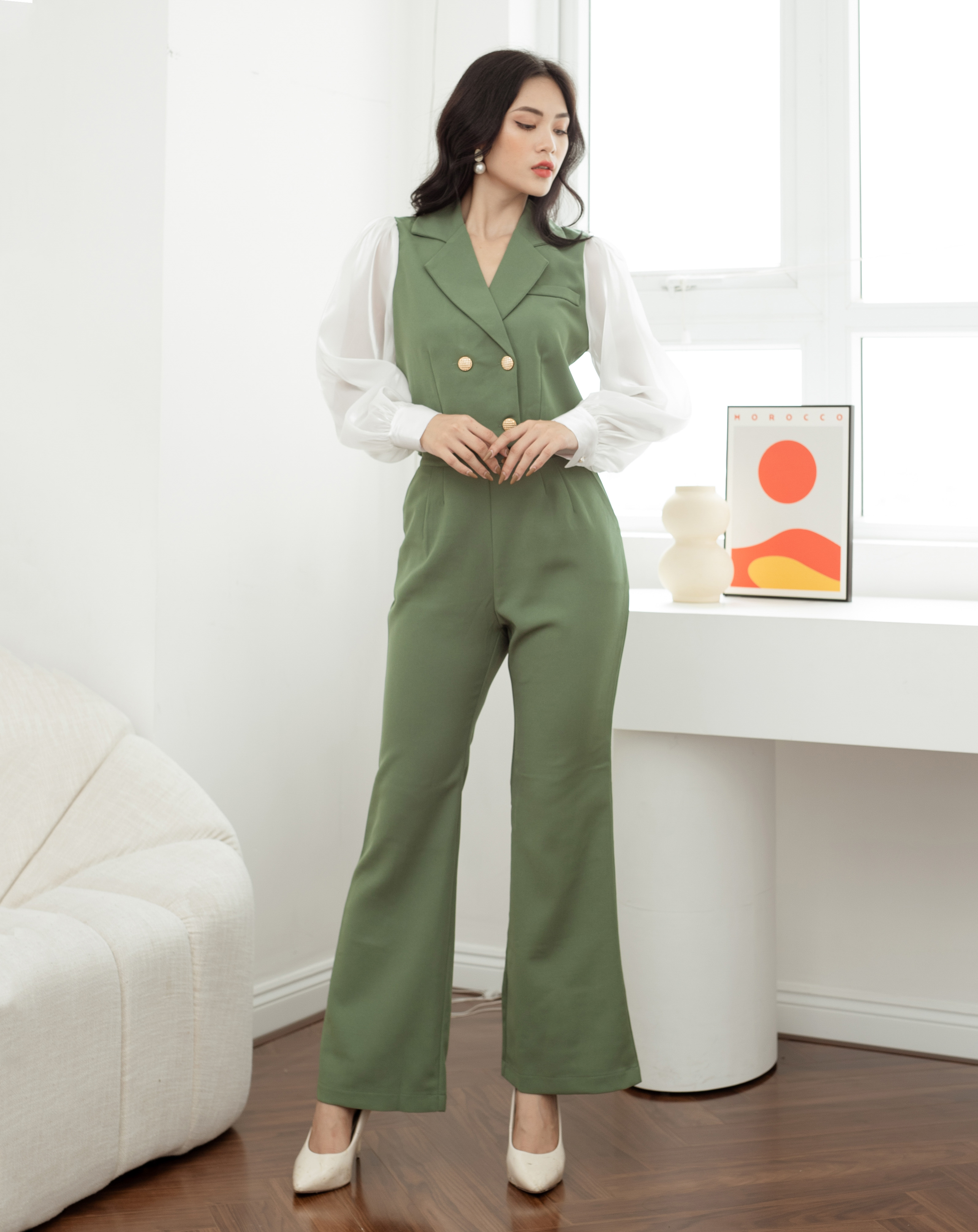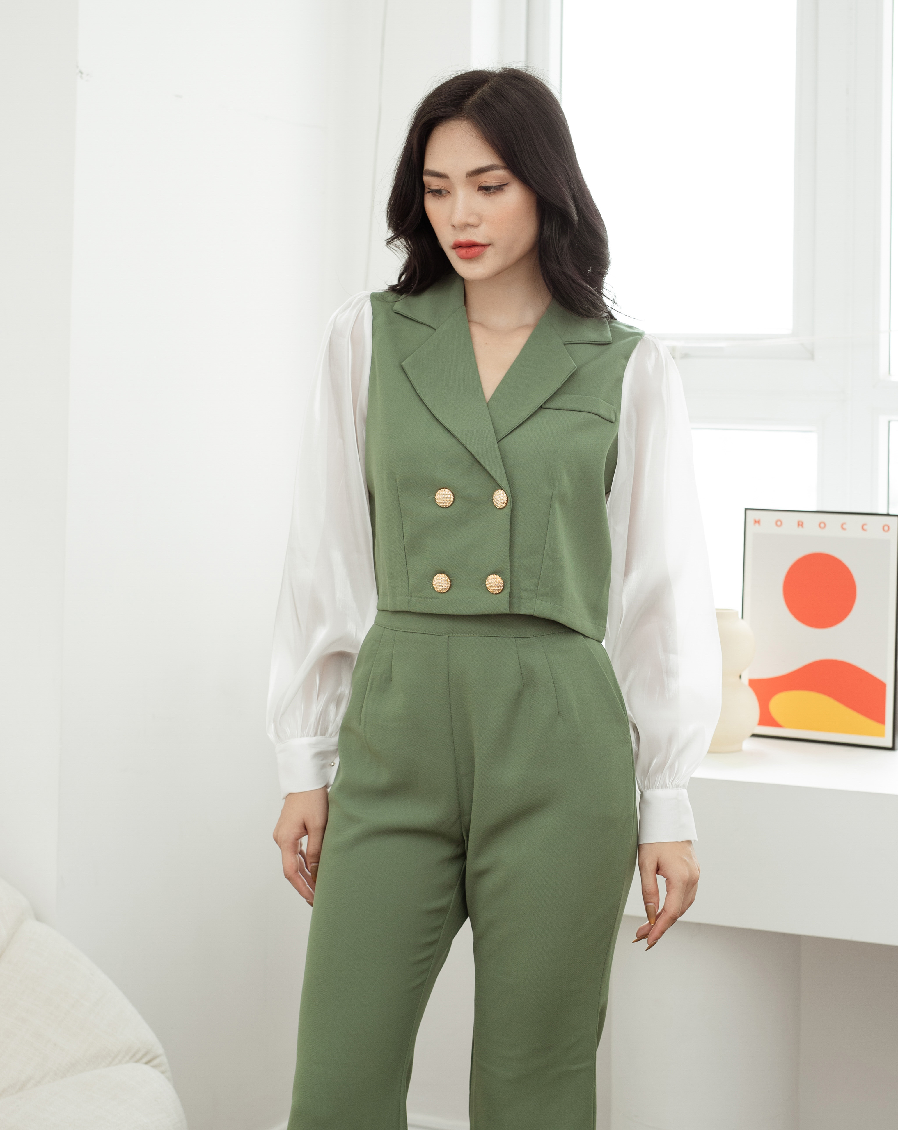 Với màu sắc xanh, tạo nên vẻ ngoài tươi sáng và trẻ trung, thu hút ánh nhìn. Sự phối màu khéo léo mang lại điểm nhấn và sự thú vị cho Set bộ phong cách này. Kiểu dáng vest lửng, tạo nên sự cá tính và phong cách. Bộ vest được thiết kế vừa vặn, làm tôn lên vẻ đẹp và sự tự tin cho nàng.